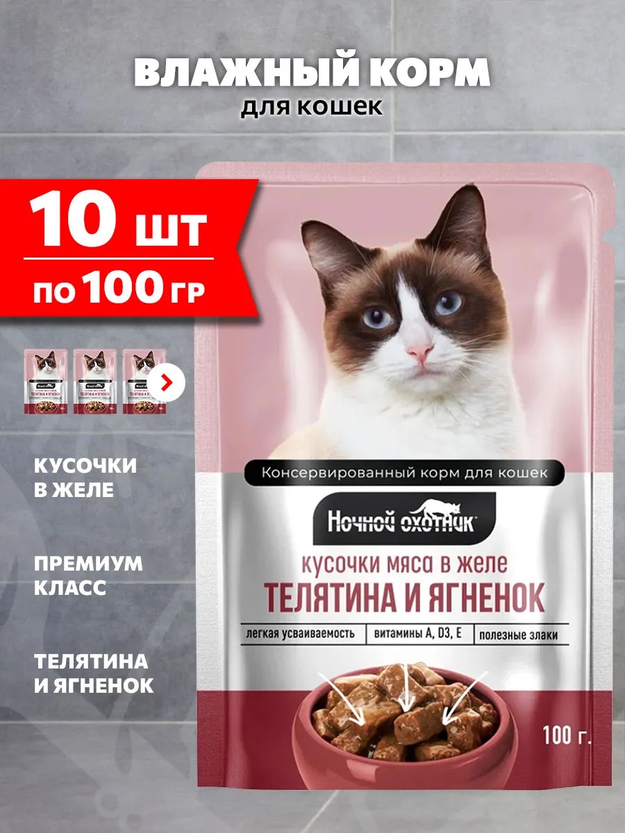Ночной охотник влажный корм для кошек - полноценный сбалансированный корм с телятиной и ягненком – это натуральные мясные кусочки в восхитительном желе для Вашего питомца.
