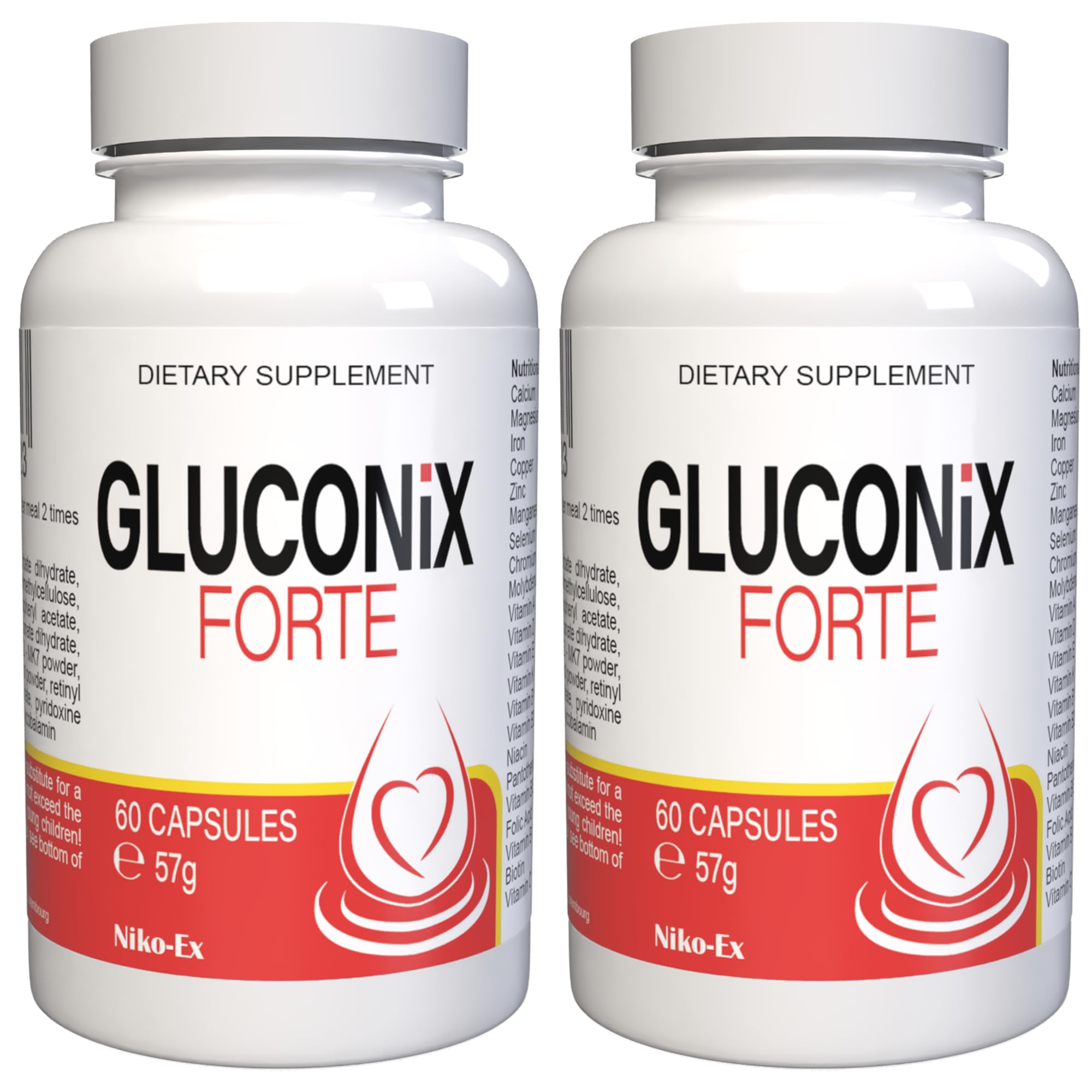 Gluconix Forte Pack of 2 x 120 capsules (2 x 60 capsules) INGREDIENTS Calcium carbonate, calcium ascorbate dihydrate, magnesium oxide, capsule shell: hydroxypropylmethylcellulose, zinc gluconate, iron bisglycinate, D-alpha tocopherol acetate, chromium(III) chloride 6-hydrate, manganese gluconate dihydrate, nicotinamide, calcium pantothenate, vitamin K2 - MK7 pulsa. ver, sodium molysate. BDAT, sodium selenite, cholecalciferol powder, retinyl acetate, copper bisglycinate, thiamine mononitrate, pyridoxine hydrochloride, riboflavin, folic acid, D-biotin, methylcobalamin DIRECTIONS Take 1 capsule twice a day (morning and evening), swallowed whole with plenty of water. SAFETY WARNING Food supplements are not a substitute for a balanced and varied diet and a healthy lifestyle. The recommended daily intake should not be exceeded. Keep out of reach of children. See more? Our promise - 100 satisfaction or your money back. We are known for our excellent customer service and thousands of satisfied customers. In case of any defect or dissatisfaction, we guarantee an immediate replacement or a full refund, no questions asked. VITAMIN B - Vitamin B1 (thiamine) contributes to normal heart function. Vitamin B2 (riboflavin) contributes to the maintenance of normal red blood cells. Vitamin B6 (pyridoxine) contributes to normal homocysteine metabolism. Vitamin B9 (folic acid) contributes to normal blood formation. [ Regulation (EC) No 1924 2006 on Health Information from the EU]. Vitamins and Minerals - Vitamin C contributes to normal collagen formation for the normal function of blood vessels - Vitamin K and calcium contribute to normal blood clotting - Vitamin A plays a role in cell specialization - Iron contributes to the normal formation of red blood cells and hemoglobin - Also contains vitamin B3, vitamin B5, vitamin B7, vitamin C, vitamin E, zinc, selenium, magnesium, copper, manganese, chromium, and molybdenum. Original Swiss recipe - Best guarantee of buying the authentic, optimal formula of 22 vitamins and minerals Contents: 60 nutrient-rich capsules Highly concentrated, 100 plant-based vegan: no fillers, no colorings or additives For men and women Easy to take Maximum safety and purity.Gluconix Forte Lot de 2 paquets de 120 capsules (2 x 60 capsules)DESCRIPTION DU PRODUIT DESCRIPTION DU PRODUIT Gluconix Forte Lot de 2 paquets de 120 capsules (2 x 60 capsules) INGRÉDIENTS carbonate de calcium, ascorbate de calcium dihydraté, oxyde de magnésium, enveloppe de la capsule : hydroxypropylméthylcellulose, gluconate de zinc, bisglycinate de fer, acétate de D-alpha tocophérol, chlorure 6-hydrate de chrome III, gluconate de manganèse dihydraté, nicotinamide, pantothénate de calcium D-calcium, vitamine K2 - MK7 pulsa. ver, molyse de sodium. bdat, sélénite de sodium, poudre de cholécalciférol, acétate de rétinyle, bisglycinate de cuivre, mononitrate de thiamine, chlorhydrate de pyridoxine, riboflavine, acide folique, D-biotine, méthylcobalamine MODE D'EMPLOI Prendre 2 fois par jour (matin et soir), 1 capsule à manger avec beaucoup d'eau et sans mâcher. AVERTISSEMENT DE SÉCURITÉ Les compléments alimentaires ne remplacent pas une alimentation équilibrée et variée et un mode de vie sain. La dose journalière recommandée ne doit pas être dépassée. Tenir hors de portée des enfants Voir plus? Notre promesse - Satisfaction à 100 ou remboursement. Nous sommes connus pour notre excellent service client et des milliers de clients satisfaits. En cas de défaut ou de mécontentement de toute nature, nous garantissons un remplacement immédiat ou un remboursement sans conditions. VITAMINE B-VITAMINE - La vitamine B1 (thiamine) contribue à une fonction cardiaque normale La vitamine B2 (riboflavine) contribue au maintien des globules rouges normaux dans La vitamine B6 (pyridoxine) contribue à un métabolisme normal de l'homocystéine dans La vitamine B9 (acide folique) contribue à une formation sanguine normale obalamine) porte à une formation normale de globules rouges [ règlement (CE) n 1924 2006 Informations relatives à la santé de l'UE]. Vitamines et minéraux - La vitamine C contribue à une formation normale de collagène pour un fonctionnement normal des vaisseaux sanguins - La vitamine K et le calcium contribuent à une coagulation sanguine normale - La vitamine A a une fonction dans la spécialisation cellulaire - Le fer contribue à la formation normale de globules rouges et d'hémoglobine - Composé également de vitamine B3, vitamine B5, Vitamine B7, vitamine C, vitamine E, zinc, sélénium, magnésium, cuivre, manganèse, chrome et molybdène. Recette originale de Suisse - Meilleure garantie d'acheter la formule optimale authentique de 22 vitamines et minéraux Contenu: 60 gélules à haute teneur en nutriments Hautement dosé, 100 végétal végétalien : sans charges, sans colorants ni additifs Pour les hommes et les femmes Facile à prendre Sécurité et pureté maximales .