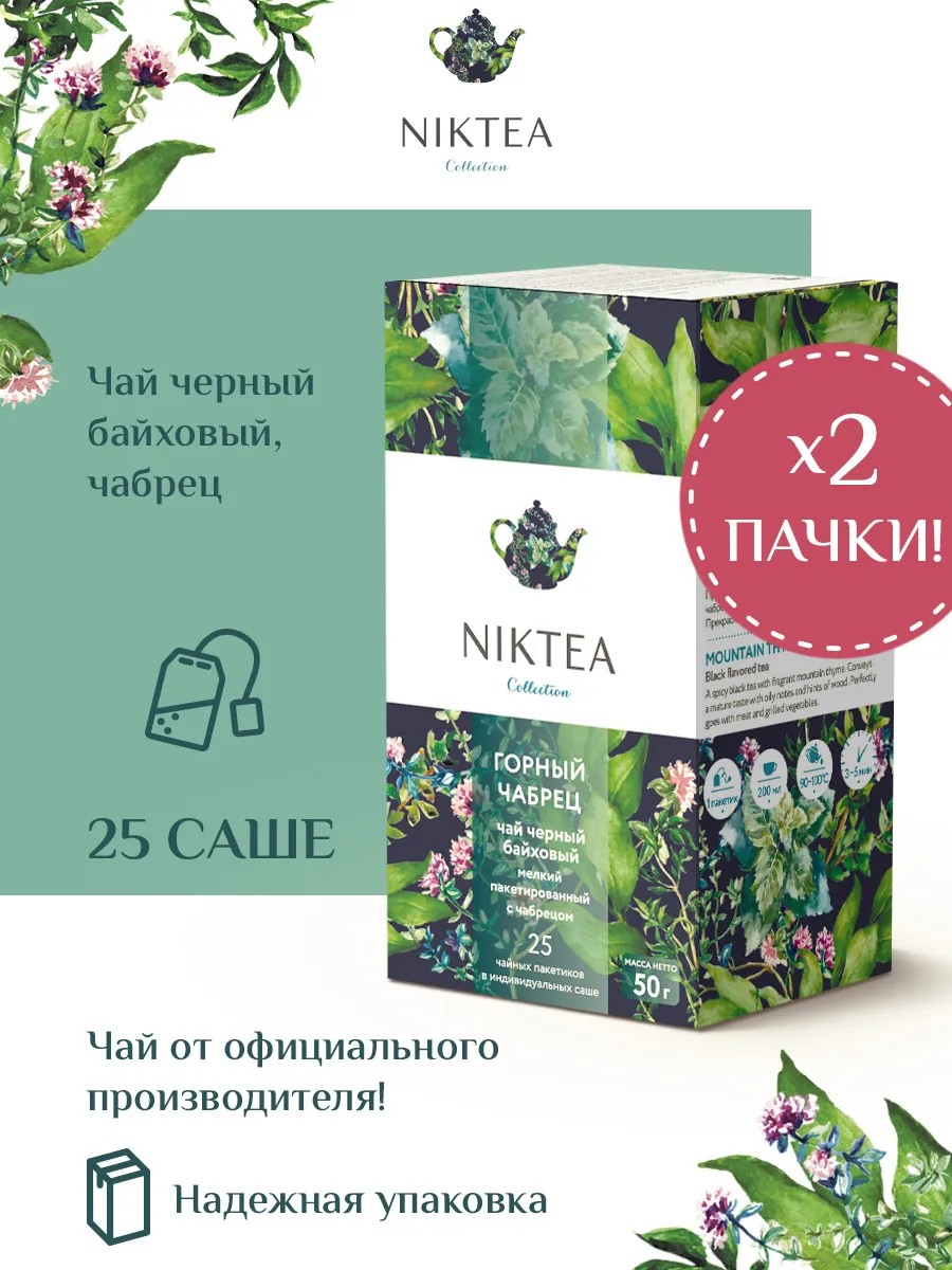 Никти Mountain Thyme - пряный черный чай с листочками душистого горного чабреца. Букет зрелый, древесный, чуть маслянистый. Прекрасно сочетается с блюдами из мяса и печеных овощей.Коллекция Никти разработана командой экспертов, имеющих богатый опыт в чайной индустрии. Во время ее создания выбирались самые надежные поставщики из Европы и стран происхождения чая, а в линейку включили не только топовые аутентичные позиции, но и новые интересные рецептуры в традициях современной чайной миксологии.Никти – это действительно качественный чай. Для истинных ценителей мы предлагаем безупречное качество: отборное сырье, фасовку на высокотехнологичном производственном комплексе в России, постоянный педантичный контроль готового продукта, а также сертификацию сырья по международным стандартам.Никти – это разнообразие. В линейках листового и пакетированного чая представлены все основные группы вкусов – от классического черного и зеленого чая до ароматизированных, фруктовых и травяных композиций.Никти – это стиль. Необычная упаковка с модным авторским дизайном создает яркий и запоминающийся стиль, а интересные коктейльные рецептуры дают возможность экспериментировать со вкусами.Фильтр-бумага для пакетированного чая Никти поставляется одним из мировых лидеров по производству специальных высококачественных бумаг — компанией Glatfelter. Чайная фильтровальная бумага Glatfelter представляет собой специально разработанный микс из натурального волокна абаки и целлюлозы. Такая фильтр-бумага обеспечивает быструю и качественную экстракцию чая, но в то же самое время не пропускает даже самые мелкие частицы чайного листа в настой. В результате вы получаете превосходный цвет, богатый вкус и насыщенный аромат чая.