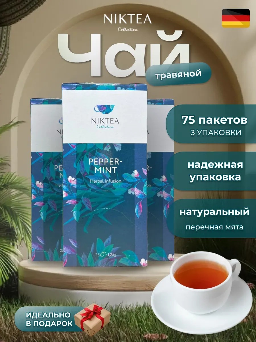 Откройте для себя уникальный чай в пакетиках от Niktea - настоящий подарок! Наш новогодний набор травяных сборов, пакетированных в красивые упаковки, не только порадует ваш вкус, но и принесет пользу вашему здоровью. Мятный чай успокаивает, а чайная заварка мяты бодрит и придает хорошее настроение. Уникальный вкус и антистрессовые свойства делают этот чай идеальным выбором как для женщин, так и для мужчин. Насладитесь чаем Niktea в ресторанном стиле прямо у себя дома - каждый пакетик содержит порцию полезного напитка, который поможет вам не только расслабиться после дня, но и поддержать ваш организм в борьбе с простудой и гриппом. Подарите себе чай Niktea - официальный продукт из Германии, который добавит яркие краски в ваш день и сделает ваше питание еще более полезным и вкусным.
