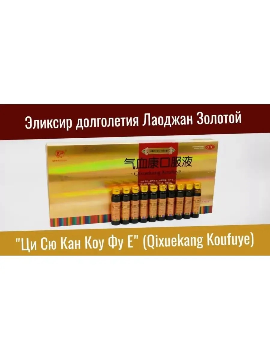 Эликсир долголетия Лаоджан - ""Ци Сюэ Кан Коуфуе"", биологически активные средства для поддержания здоровья и замедления процессов старения. Влияют на работу коры надпочечников, гипофиза, щитовидной железы, укрепляют иммунитет, сердечно-сосудистую систему. Помогают после травм, операций, химио- и радиотерапии, приеме антибиотиков, лечении опухолей, заживлении ран. Содержат женьшень для улучшения настроения и работоспособности, астрагал хуанчи для контроля кровяного давления и предотвращения тромбозов, гинура перистонадрезная и корень пуэрарии волосистой с противовоспалительным и противоопухолевым действием. В составе имеется мед с антибактериальным эффектом, тростниковый сахар, кальций, магний, железо, фосфор, калий, бензойная кислота. Принимать перорально с указанной дозировкой.