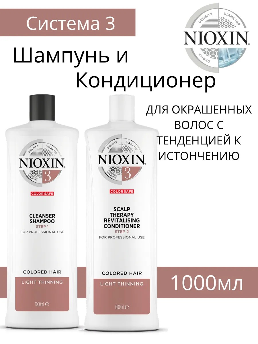 Использование Nioxin системы 3 шампуня и кондиционера регулярно поможет вам достичь более здоровых, сильных и объемных волос. Подходит для ежедневного использования на всех типах волос, особенно рекомендуется для обработки волос с тонкой текстурой и окрашенной. Способ применения: равномерно распределите шампунь легкими массирующими движениями на коже головы и волосах. Смойте водой. Нанесите кондиционер от корней до кончиков волос. Оставьте на 1-3 минуты.