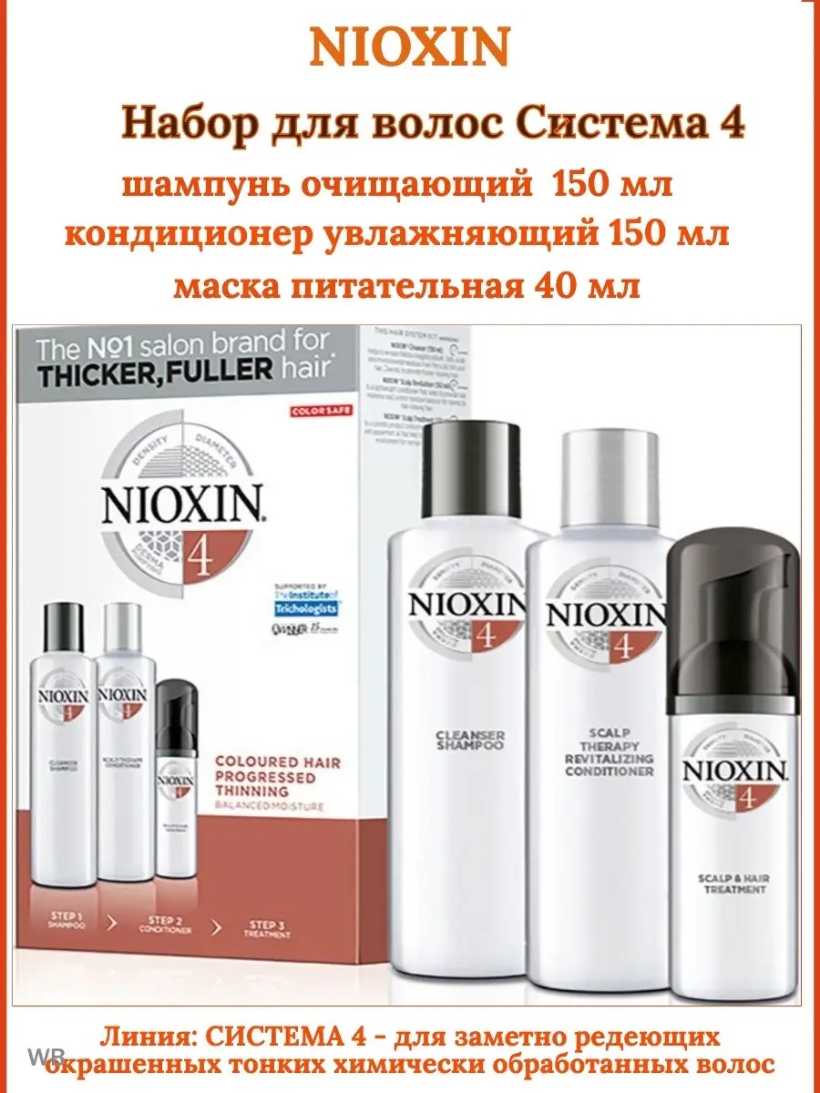 NIOXIN 4 Набор 150мл+150мл+40мл. Специально подобранный состав системы 4 предназначен для ежедневного и бережного ухода за тонкими, химически обработанными (окрашенными), заметно редеющими волосами.Состав набора. Очищающий шампунь Nioxin 4 (150 мл) деликатно и бережно очищает и ухаживает не только за волосами, но и кожей головы, защищает от вредного влияния факторов окружающей среды, придает волосам заметный объем. Увлажняющий кондиционер Nioxin 4 (150 мл) имея легкую консистенцию восстанавливает упругость волос, помогает контролировать баланс увлажнения кожи головы и волос. Лучшая питательная маска для волос Nioxin 4 (40 мл) содержит антиоксиданты, растительные экстракты и другие необходимые для здоровья кожи головы и волос компоненты, придающие волосам заметный объем, укрепляющие, а так же стимулирующие рост волос, а так же освежающие кожу головы. В состав продуктов системы 4входят такие полезные и безопасные компоненты как аминокислоты цистина, способствующие утолщению волоса, создавая ощущение густоты и предотвращая повреждения и ломкость волос. Так же в составе продуктов системы 4 есть экстракт белого чая, масла перечной мяты и увлажняющие добавки, которые обеспечивают защиту цвета и ухаживают за окрашенным волосом, контролируя баланс их увлажнения по всей длине волос. В продуктах линейки системы 4 содержатся витамины, растительные экстракты УФ-фильтры, которые очищают, ухаживают и защищают от вредного воздействия окружающей среды и солнечного излучения.