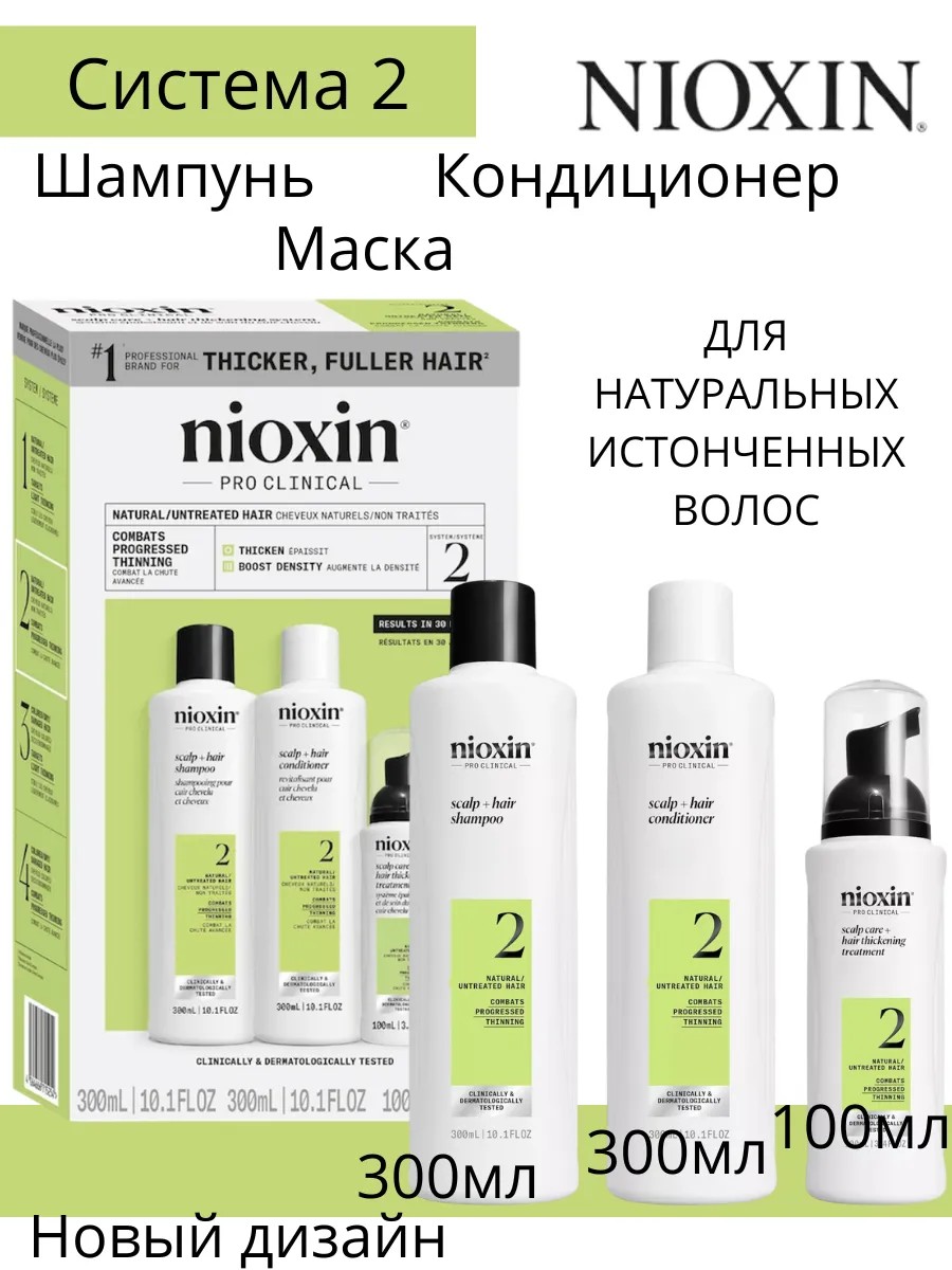 NIOXIN System 2 for Fine Hair is designed specifically for hair prone to thinning, hair loss, and breakage. It promotes thick, healthy-looking hair while protecting the scalp. NIOXIN Clarifying Shampoo gently removes impurities and cleanses scalp pores. The shampoo's nutrients penetrate the epidermis, nourishing hair follicle cells with macro- and micronutrients. The conditioner adds volume, elasticity, and shine. The nourishing mask is a cocktail of active antioxidants, plant extracts, and vitamin complexes for healthy hair. The system includes three hair care products based on an advanced approach to scalp and hair care. The products are specially formulated to strengthen hair and add visual thickness. The system prevents hair loss, strengthens hair, and restores the scalp, giving natural, slightly thinning hair a healthy shine. The shampoo cleanses the hair and scalp. This moisturizing conditioner restores hair elasticity and helps maintain the scalp and hair's moisture balance. This nourishing mask restores the scalp and increases hair volume. Directions: Step 1: Apply the cleansing shampoo to damp hair and gently massage into the scalp for one minute. Rinse thoroughly with water. Recommended for daily use. Step 2: After cleansing, evenly apply the moisturizing conditioner to the scalp and hair. Leave on for 1-3 minutes. Rinse thoroughly with water. Step 3: Evenly apply the nourishing mask to the scalp and gently massage. Do not rinse! Temporary redness in the areas of application may occur due to increased blood flow.