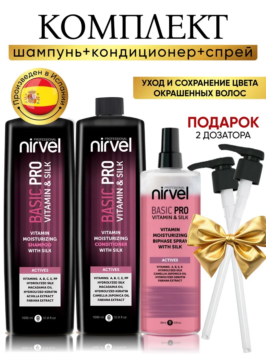 Шампунь, кондиционер и спрей Basic Pro Vitamin & Silk, с витаминами и шелком, от испанского производителя NIRVEL PROFESSIONAL — это уникальное средство для ухода за волосами, которое сочетает в себе эффективность и легкость использования.