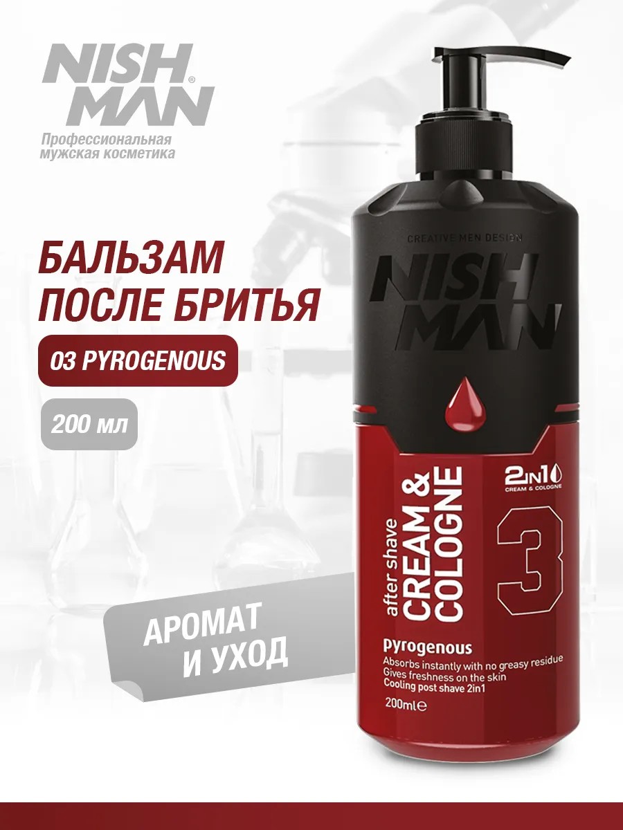 NISHMAN 03 Pyrogeneous Aftershave Cream is a unique product for additional protection after shaving. This cream has a non-greasy texture that quickly penetrates the skin, protecting it. Ideal for all skin types, it helps combat dryness and flaking while moisturizing. This cream is quickly absorbed into the skin, has a soothing effect, and reduces redness. Its unique formula is specially designed for daily use after shaving. Using this product, your skin will feel hydrated throughout the day. This cream cologne does not leave a greasy shine and has an anti-inflammatory effect. Therefore, it not only protects the skin from irritation but also provides care. This aftershave cream has a creamy texture that provides additional protection for your facial skin. Apply to your face after each shave for a pleasant and painless shaving experience. It soothes, softens, and nourishes the skin, creating a protective barrier against negative environmental influences (sun, wind), leaving it smooth and supple. Treat your loved ones with a unique aftershave product. Give this cream cologne to your loved one, husband, dad, friend, or brother for New Year's, birthday, or February 23rd. Let your loved ones feel comfortable every time they shave.