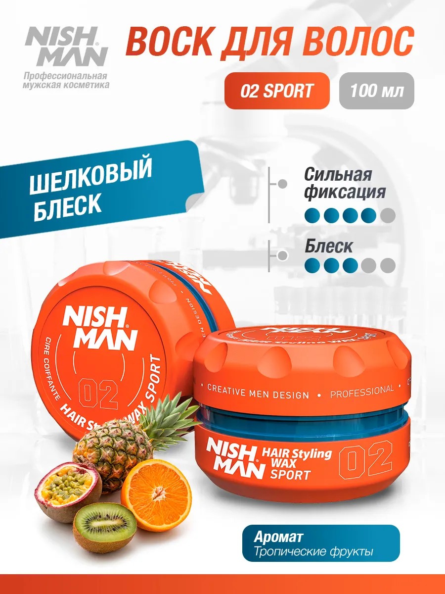 Воск для волос мужской NISHMAN 02 Sport на водной основе средней фиксации с ароматом тропических фруктов - это профессиональное средсво для укладки волос. Идеально подходит для придания текстуры волосам короткой и средней длины, придавая естественный блеск и не оставляя следов после нанесения. Глянцевый гель сохранит укладку и естественный вид в течении всего дня, а также позволит создать эффект мокрых волос. Гель-воск не склеивает и не утяжеляет волосы. Легко наносится и смывается благодаря водной основе. Воски данной линейки имеюют полуматовый эффект. Профессиональное средство необходим каждому мужчине для создания модельной прически, укладки. Подходит для волос короткой и средней длины. Консистенция воска гелеобразная и приятная на ощупь, не склеивает пряди, не утяжеляет волосы, а также легко наносится и смывается. Подходит для использования на каждый день. Воск продается в компактных баночках 100 мл. Данного объем хватит на долгое применение. Способ применения: нанесите небольшое количество воска на ладони и разотрите. Затем равномерно распределите воск на сухие или влажные волосы, придайте прическе форму и текстуру. Вуаля, и Вы неотразимы! Воск для укладки волос - отличный подарок для мужчины на день рождения, выпускной, 14 или 23 февраля, именины. В нашем магазине Вы можете заказать также воски для стайлинга с ароматами: Тропические фрукты Манго Восточные цветы Лесные ягоды Персик Черная ваниль Кола Жвачка Бабл-Гам. Паста для волос мужская, стайлинг для волос, hair wax, турция косметика.