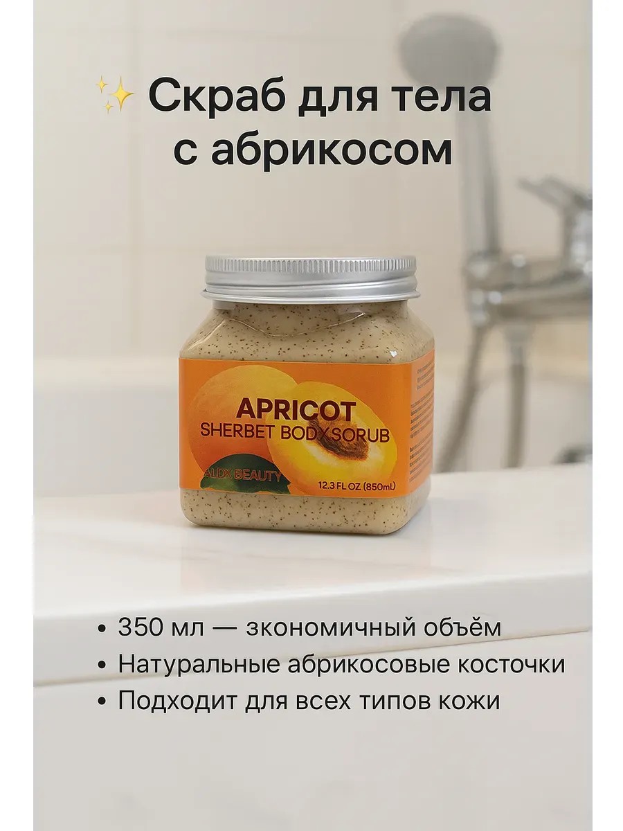 Скраб для тела с абрикосом — натуральное средство для бережного, но глубокого очищения кожи. Мелкие частицы абрикосовой косточки эффективно удаляют ороговевшие клетки, стимулируют обновление и делают кожу гладкой и шелковистой. Экстракт абрикоса питает, смягчает и восстанавливает кожу, а питательные масла защищают её от сухости.