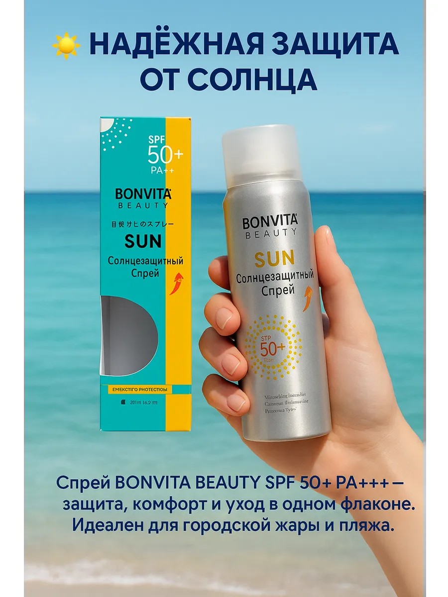 Солнцезащитный спрей для тела BONVITA BEAUTY SPF 50+ PA+++ — это надёжная защита от солнечных лучей без ощущения липкости и белых следов. Идеально подходит для жарких дней, пляжа и активного отдыха.
