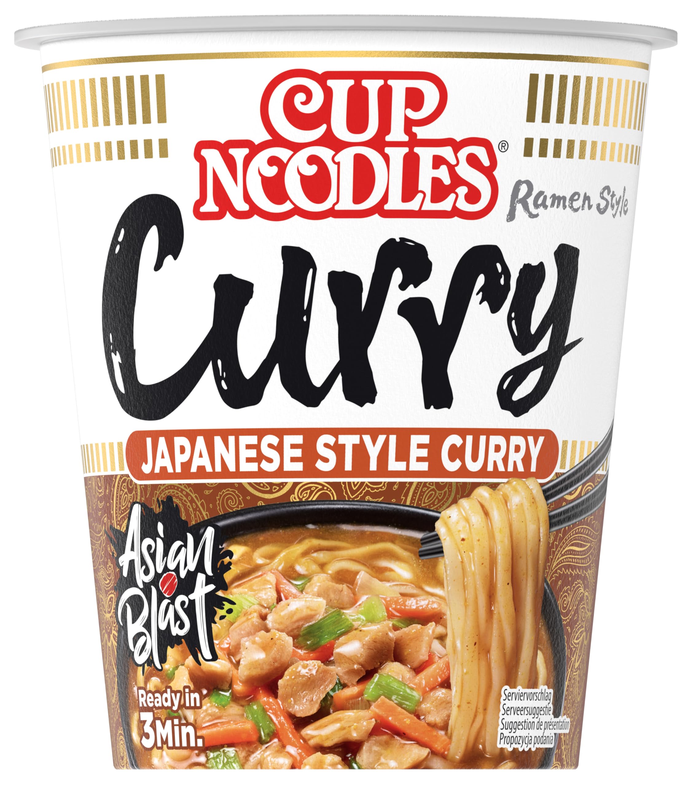Nissin Cup Noodles - Curry - Pack of 8 Bring Asian cuisine home and to the office with Nissin Cup Noodles. The easy preparation of these instant noodles makes for a quick meal on the go and ensures a special taste experience anytime. The combination of delicious chicken, authentic Japanese curry, fine vegetables, and perfectly coordinated spices guarantees a quick and original Japanese meal. Simply pour boiling water into the convenient cup, wait 3 minutes, and you're done. The dried noodles and other ingredients are transformed in a flash into a healthy, hot, and flavorful dish that can be enjoyed anytime, anywhere. Just buy, prepare, and enjoy. Product features: Japanese-style wheat noodles. Quick and easy preparation with boiling water. No dishes or other ingredients required. Ideal when you need to be quick. In 1958, Momofuku Ando Chicken Ramen, the world's first instant noodles, laid the foundation for an entire industry. Its Cupnoodles have become an integral part of global food culture. Since then, the Nissin Foods Group has explored numerous ways to produce safe and healthy food and creates delicacies that are a true dream in terms of taste. Whether at work or at home, the famous Cupnoodles are ideal for on-the-go or when you need a quick meal. INGREDIENTS Ingredients: Noodles 77.6 [Wheat Flour, Palm Oil, Table Salt, Flavor Enhancer (E621), Flour Treatment Agent (E500, E451), Antioxidant (E306), Acidity Regulator (Citric Acid)], Sugar, Maltodextrin, Curry Powder 2.1 [Spices (Mustard), Wheat. Smoked, cooked salt, spices 1.7 , textured wheat protein preparation [Wheat GLUTEN, stabilizer (E516), flavor enhancers (E621, E627, E631), garlic powder, table salt, yeast extract, potato powder, flavorings (contains wheat, soy, milk), carrots, spring onions, modified starch, hydrolyzed corn protein, thickener (E415), dextrose, chicken powder, skimmed milk powder, soy sauce powder (soybeans, wheat, table salt, maltodextrin), release agents (E551), colors (E150c, E160c), Worcestershire sauce powder, dextrin, molasses, wine vinegar, corn syrup, table salt, spices (SALTED), color (E150d), sugar, tamarind, flavoring]. May contain traces of crustaceans. Contains fish, shellfish, and sesame. INSTRUCTIONS FOR USE Open the lid, pour in boiling water, wait 3 minutes, and enjoy. SAFETY WARNING May contain traces of crustaceans, fish, milk, shellfish, mustard, and sesame. See moreNissin Cup Noodles Lot de 8 nouilles instantanées au curry de style japonais, saveur poulet, curry et légumes, préparation rapide dans une tasse, nourriture asiatique (8 x 63 g)DESCRIPTION DU PRODUIT DESCRIPTION DU PRODUIT Nissin Cup Noodles - Curry - Lot de 8 Avec les Nissin Cup Noodles, apportez la cuisine asiatique à la maison et au bureau. La préparation facile des nouilles instantanées permet même un repas rapide en déplacement et assure à tout moment une expérience gustative spéciale. La composition d'un délicieux goût de viande de poulet, de curry japonais authentique, de légumes fins et d'épices parfaitement coordonnées garantit un repas japonais original et rapide. Il suffit de verser de l'eau bouillante dans le gobelet pratique, d'attendre 3 minutes et le tour est joué. Les nouilles séchées ainsi que les autres ingrédients se transforment en un tour de main en un plat sain, chaud et savoureux qui peut être consommé à tout moment et n'importe où. Il suffit d'acheter, de préparer et de profiter. Le produit possède les propriétés suivantes : Pâtes de blé de style japonais. Préparation facile et rapide avec de l'eau bouillante. Pas de vaisselle ou d'autres ingrédients nécessaires. Idéal lorsque vous devez aller vite. En 1958, Momofuku Ando Chicken Ramen, les premières nouilles instantanées au monde, créant ainsi la base d'une industrie entière. Ses CUPNOODLES ont fait partie intégrante de la culture alimentaire mondiale. Depuis lors, le groupe Nissin FOODS explore de nombreuses façons de produire des aliments sûrs et sains et crée des délices qui sont un véritable rêve en termes de goût. Que ce soit au travail ou à la maison, les célèbres CUPNOODLES sont idéales pour les déplacements ou quand il faut aller vite INGRÉDIENTS Ingrédients : pâtes 77,6 [farine de blé, huile de palme, sel de table, exhausteur de goût (E621), agent de traitement à la farine (E500, E451), antioxydant (E306), régulateur d'acidité (acide citrique)], sucre, maltodextrine, poudre de curry 2,1 [épices (moutarde), blé. Fumée, cuisson sel, épices 1,7 , préparation de protéines de blé texturées [GLUTEN de blé, stabilisateur (E516], exhausteur de goût (E621, E627, E631), poudre d'ail, sel de table, extrait de levure, poudre de pomme de terre, arômes (contient du blé, du soja, du lait), des carottes, des oignons verts n, amidon modifié, protéines de maïs hydrolysées, épaississant (E415), dextrose, poudre de poulet, poudre de lait écrémé, poudre de sauce de soja (fèves de soja, blé, sel de table, maltodextrine), agents de démoulage (E551), colorants (E150c, E160c), poudre de sauce Worcestershire. dextrine, mélasse, brindille vinaigre de vin, sirop de maïs, sel de table, épices (SELLERIE), colorant (E150d), sucre, tamarin, arôme]. Peut contenir des traces de crustacés, de poisson, de mollusques et de sésame. MODE D'EMPLOI Ouvrez le couvercle, versez de l'eau bouillante, attendez 3 minutes et profitez. AVERTISSEMENT DE SÉCURITÉ Peut contenir des traces de crustacés, de poisson, de lait, de mollusques, de moutarde et de sésame. Voir plus