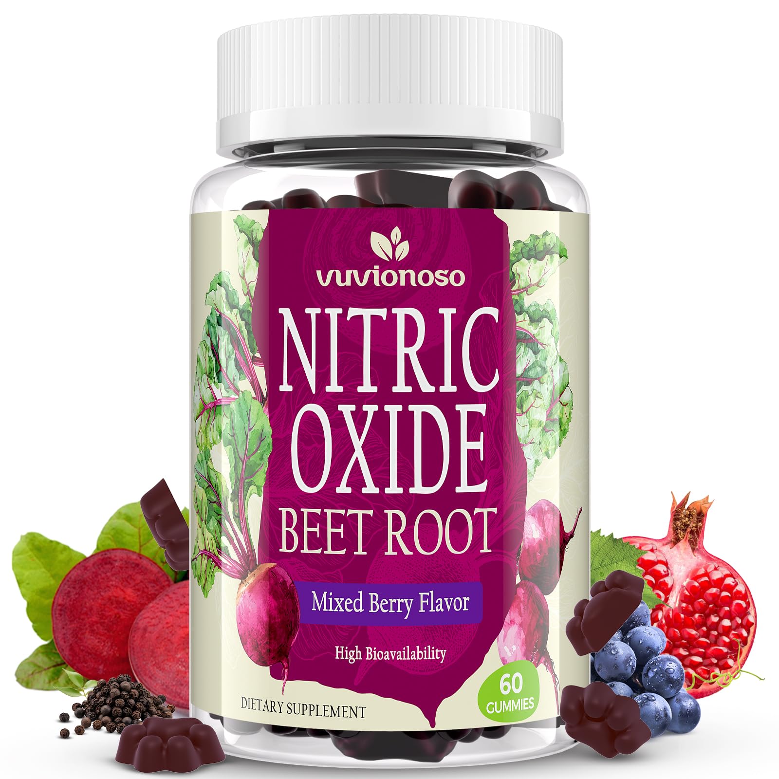 Sugar-Free Formula: These nitric oxide booster gummies are gluten-free and vegetarian-friendly. With a fun cat-paw design, each bottle includes 60 beet root chews — a 30-day serving. Daily Nutrient Blend: A formula featuring grapeseed extract, pomegranate powder, Vitamin C, Vitamin B12, and black pepper extract — key nutrients with the natural benefits of beetroot. Stamina Performance: Formulated with Glutathione and Glycine Propionyl-L-Carnitine (GPLC), these beet chews deliver a nutrient blend. Mixed Berry Flavor: Sugar-free nitric oxide gummies with a refreshing blend of berries and pomegranate — a tasty way to enjoy beetroot daily. Nitric Oxide Booster: Each serving combines organic beetroot, naturally rich in nitric oxide, with black pepper extract for absorption.