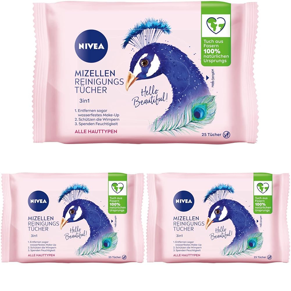 Ingredients ingredients Aqua, Alcohol Denat., PEG-40 Hydrogenated Castor Oil, Tocopheryl Acetate, Tocopherol, Glycerin, Sorbitol, Poloxamer 124, Decyl Glucoside, Polyquaternium-10 Cocyl Glutamate, Sodium Sulfate, Propylen Cerin, 1.2-Hexanediol, Trisodium EDTA, Citric Acid, Phenoxyethanol, Linalool, Citronellol, Geraniol, Benzyl Alcohol, Alpha Isomethyl Ionone, Citral, BHT, perfumeScope of delivery Details-Nivea 3in1 Hello Beautiful!Micelle cleaning towels, 25 pieces, suitable for every skin type, ideal for daily application, article number 89252. Free of microplastics - the mild formula of facial cleaning towels contains 97 ingredients of natural origin and is completely free of microplastics.Skin Environment - Out of love for skin environment, the soft Nivea cleaning towels for the face made of cloth fibers are 100 natural origin.Natural moisture balance - the cleaning towels provide moisture, refresh the skin and protect the natural moisture balance of the skin.Micelle facial cleaning-the micelle make-up towels with vitamin E clean the skin thoroughly and remove waterproof make-up and mascara.The following information applies to each unit per pack.INHALTSSTOFFE ZUTATEN Aqua,Alcohol Denat.,PEG-40 Hydrogenated Castor Oil,Tocopheryl Acetate,Tocopherol,Glycerin,Sorbitol,Poloxamer 124,Decyl Glucoside,Polyquaternium-10,Disodium Cocoyl Glutamate,Sodium Chloride,Sodium Sulfate,Propylene Glycol,Ethylhexylglycerin,1,2-Hexanediol,Trisodium EDTA,Citric Acid,Phenoxyethanol,Linalool,Citronellol,Geraniol,Benzyl Alcohol,Alpha-Isomethyl Ionone,Citral,BHT,ParfumLieferumfang Details – NIVEA 3in1 Hello Beautiful! Mizellen Reinigungstücher, 25 Stück, für jeden Hauttyp geeignet, ideal für die tägliche Anwendung, Artikelnummer 89252. Frei von Mikroplastik – Die milde Formel der Gesichtsreinigungstücher beinhaltet 97 Inhaltsstoffe natürlichen Ursprungs und ist komplett frei von Mikroplastik. Haut Umwelt – Aus Liebe zu Haut Umwelt sind die weichen NIVEA Reinigungstücher für das Gesicht aus Tuchfasern 100 natürlichen Ursprungs. Natürliche Feuchtigkeitsbalance – Die Reinigungstücher spenden Feuchtigkeit, erfrischen die Haut und schützen die natürliche Feuchtigkeitsbalance der Haut. Mizellen Gesichtsreinigung – Die Mizellen Abschminktücher mit Vitamin E reinigen die Haut gründlich und entfernen selbst wasserfestes Make-Up und Mascara. Die folgenden Informationen gelten für jede Einheit pro Packung.NIVEA 3in1 Hello Beautiful! Mizellen Reinigungstücher (25 Stück), sanfte Gesichtsreinigungstücher mit Vitamin E, Abschminktücher entfernen Make-Up wasserfeste Mascara (Packung mit 3) 25 stück (3er Pack)