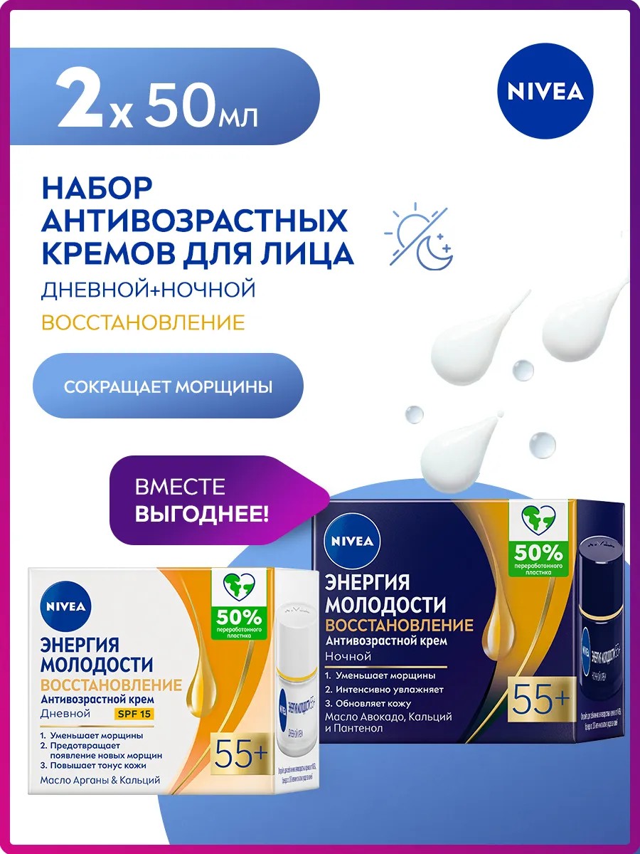 Для достижение оптимального результата используйте в сочетании с ночным кремом «Энергия Молодости» Восстановление 55+ от NIVEA.