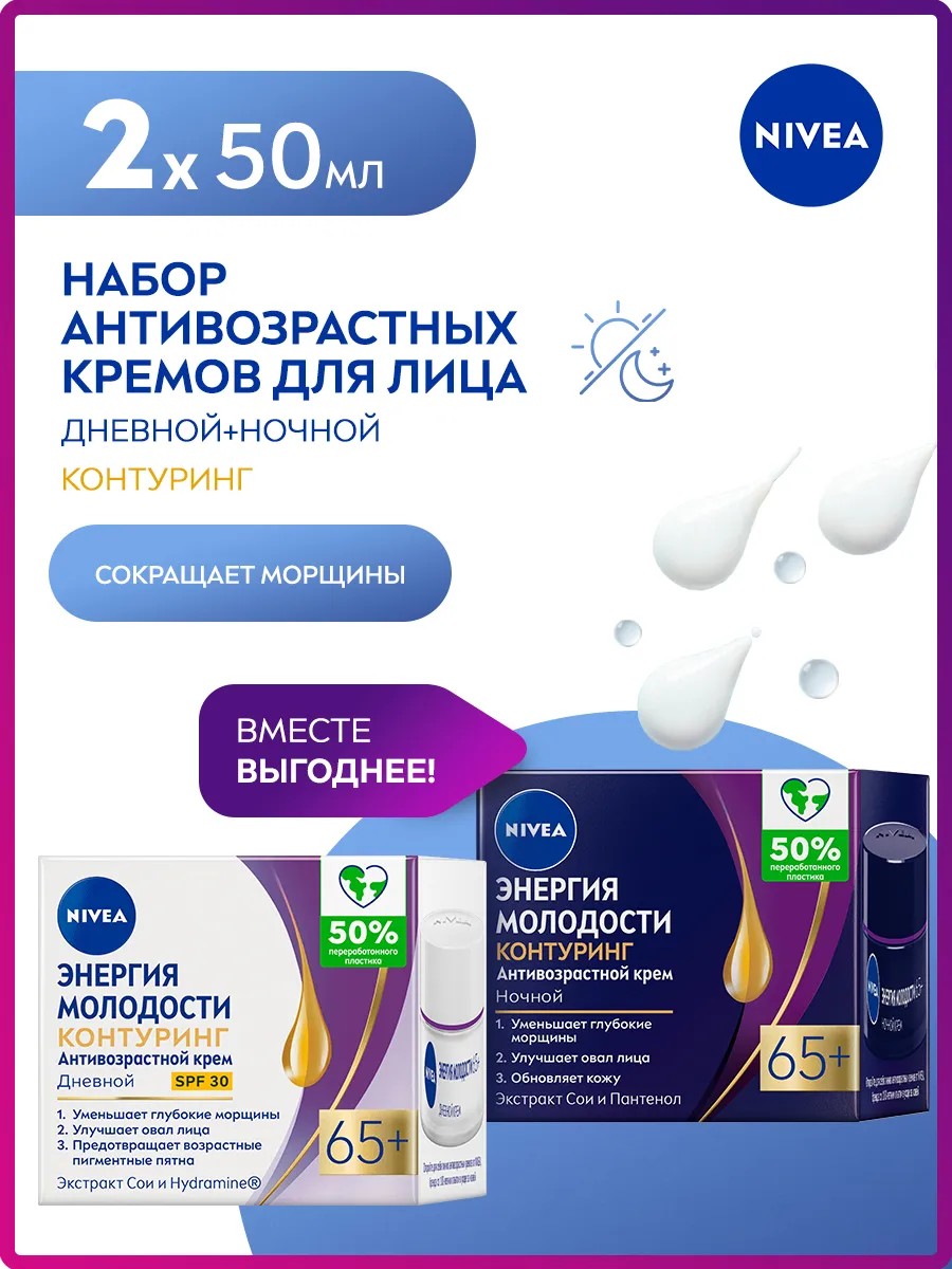 Дневной крем «Энергия Молодости» Контуринг 65+ с SPF 30 NIVEA улучшает овал лица, заметно сокращает глубокие морщины и обеспечивает интенсивное увлажнение. Крем для лица содержит натуральный экстракт сои, hydramine и УФ-фильтры, которые защищают от солнца и помогают предотвратить появление пигментных пятен.
