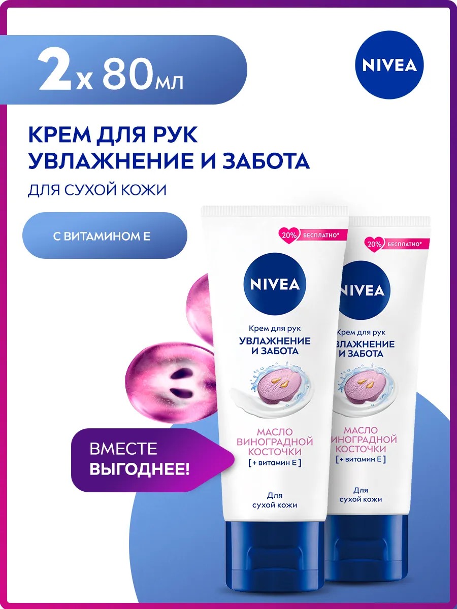Нежная кожа рук регулярно подвергается воздействию негативных факторов, таких как частое применение антисептиков, холодный ветер, дождь, другие воздействия окружающей среды. Все это может привести к возникновению ощущения сухости, стянутости и дискомфорта. Прощайтесь с сухостью кожи! Попробуйте крем для рук «Увлажнение и забота» от NIVEA с маслом виноградной косточки и витамином Е. Крем глубоко питает и увлажняет кожу, придавая рукам ухоженный вид.