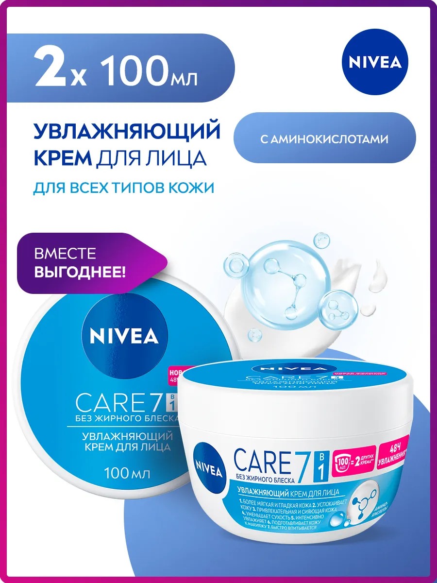 Откройте секрет интенсивного увлажнения с кремом для лица NIVEA Care 7в1! Его формула с аминокислотами глубоко питает кожу, обеспечивая 48 часов* увлажнения и делая ее мягкой, гладкой и сияющей. Крем интенсивно увлажняет, уменьшает сухость, успокаивает кожу, устраняя ощущение стянутости, и придает естественное сияние, делая кожу более привлекательной. Легкая текстура быстро впитывается, не оставляя жирного блеска. Увлажняющий крем подготавливает кожу к макияжу, улучшая его нанесение. Экономичный формат 100 мл, равный 2 другим кремам** позволяет наслаждаться уходом дольше.