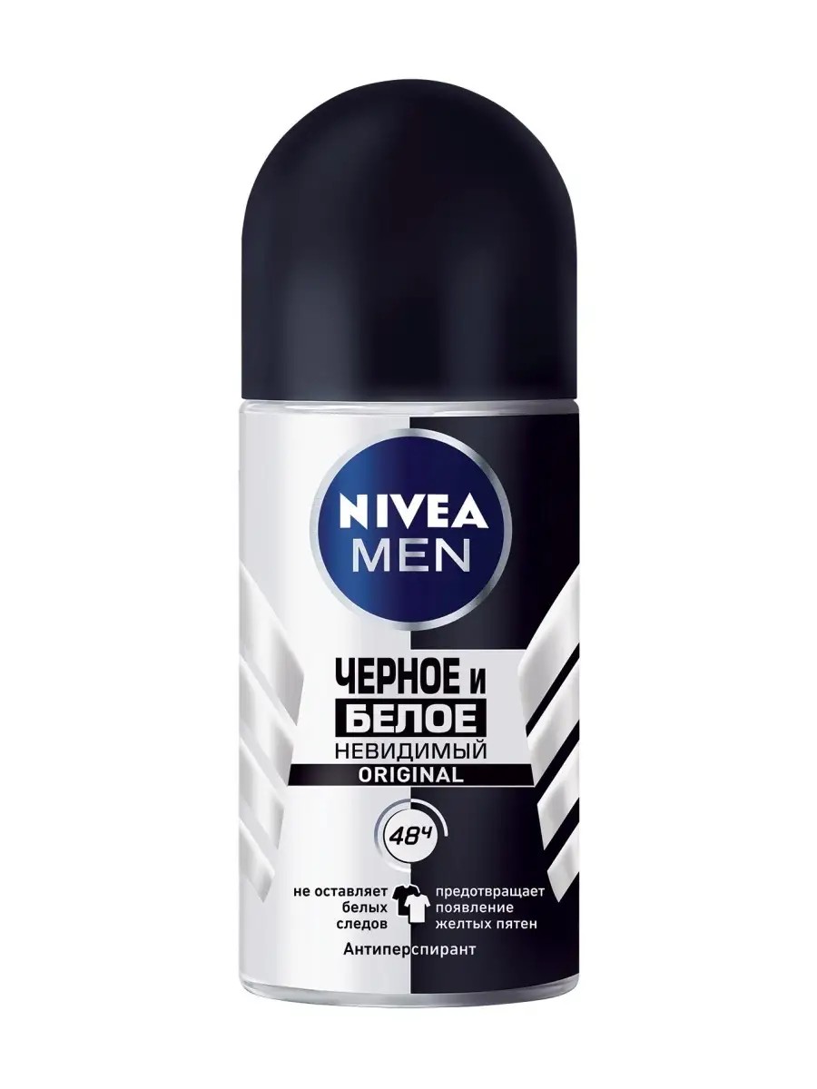 Роликовый дезодорант-антиперспирант Nivea men Черное и Белое Невидимый Original предотвращает появление белых пятен на темной одежде и желтых пятен на светлой. Черная одежда остается черной, а белая одежда дольше остается белой.