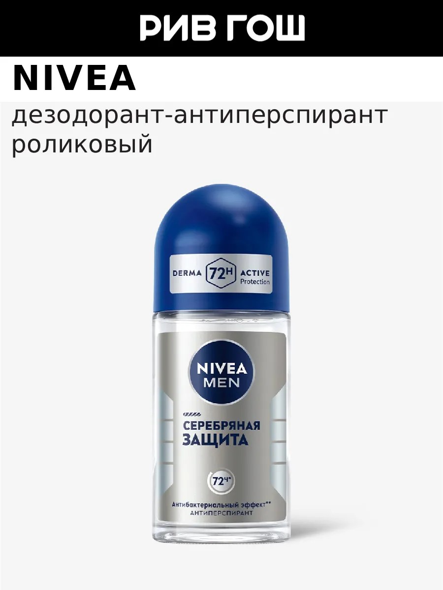 Дезодорант-антиперспирант ролик Nivea Men серебряная защита с уникальной антибактериальной формулой с ионами серебра для защиты от пота и запаха на 99,9%*. Ни один другой драгоценный металл не обладает столь сильными антибактериальными и противовоспалительными свойствами, как серебро. Кроме антибактериального эффекта, продукт успокаивает кожу и имеет свежий мужской аромат.