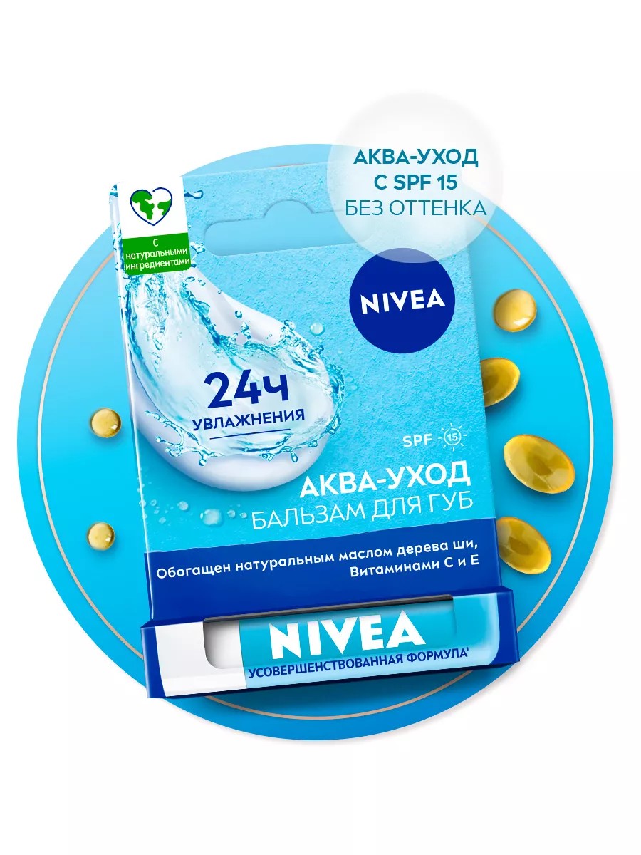 Хотите, чтобы губы оставались увлажненными 24 часа*? Попробуйте бальзам для губ "Аква-уход" от NIVEA с усовершенствованной' формулой, натуральным маслом дерева ши и витаминами С и Е. Легкая водостойкая формула бальзама для губ мгновенно тает на губах, придавая мягкость и гладкость, защищает губы от мороза и ветра, а наличие фактора защиты SPF 15 предохраняет от воздействия UVA/UVB излучения. Подходит для использования в любое время года, особенно в сухой летний период или холодный зимний. Гигиеническая помада ухаживает за губами, придавая им более гладкий и увлажненный вид. Натуральные масла и витамины в составе. Дерматологически протестировано. Применение: наносите бальзам на чистую и сухую кожу губ, обновляйте бальзам на губах по мере необходимости и в зависимости от состояния кожи губ. На 100% безопасное для климата произволдство.** Упаковка из переработанного картона: подходит для дальнейшей переработки.