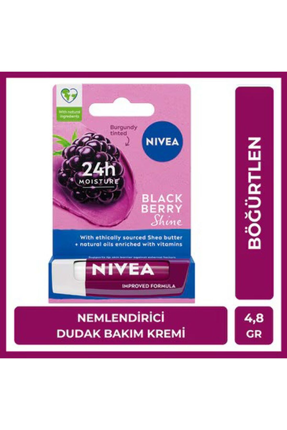 NIVEA Blackberry Lip Care Cream and Lip Gloss from NIVEA, the Skin Care Expert for Over 110 Years! Pamper your lips with the scent of blackberry lip care cream and its light burgundy shine! Lips are exposed to countless factors in daily life. Sun, cold and warming dry air leave the sensitive skin of our lips without moisture. Unlike the rest of our face, the skin of the lips has neither sebaceous glands nor a protective layer of oil. As a result, our lips crack easily and lose their natural beauty. Its unique formula, enriched with shimmering pigments, instantly melts onto your lips and keeps them moisturized for 24 hours . It distributes evenly on your lips so you don't need a mirror to apply it! 24 Hour Lip care: It moisturizes your lips and provides soft lips all day long. Burgundy Shine: It gives your lips a natural sparkling appearance and its effect lasts for a long time. Its compatibility with the skin is dermatologically approved.