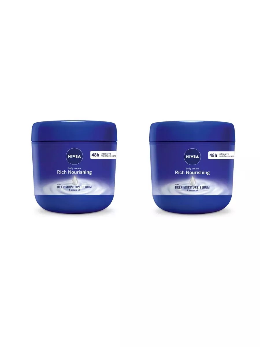 Nivea, Крем для тела Интенсивный питательный, 400 мл. Комплект 2 шт. Крем состоит из специального комплекса витаминов и минералов, а также из миндального масла, обеспечивающее интенсивное питание кожи. Обладает приятным ароматом и способен эффективно побороть сухость кожи. Он отлично впитывается за короткий промежуток времени и при этом не оставляет следов.