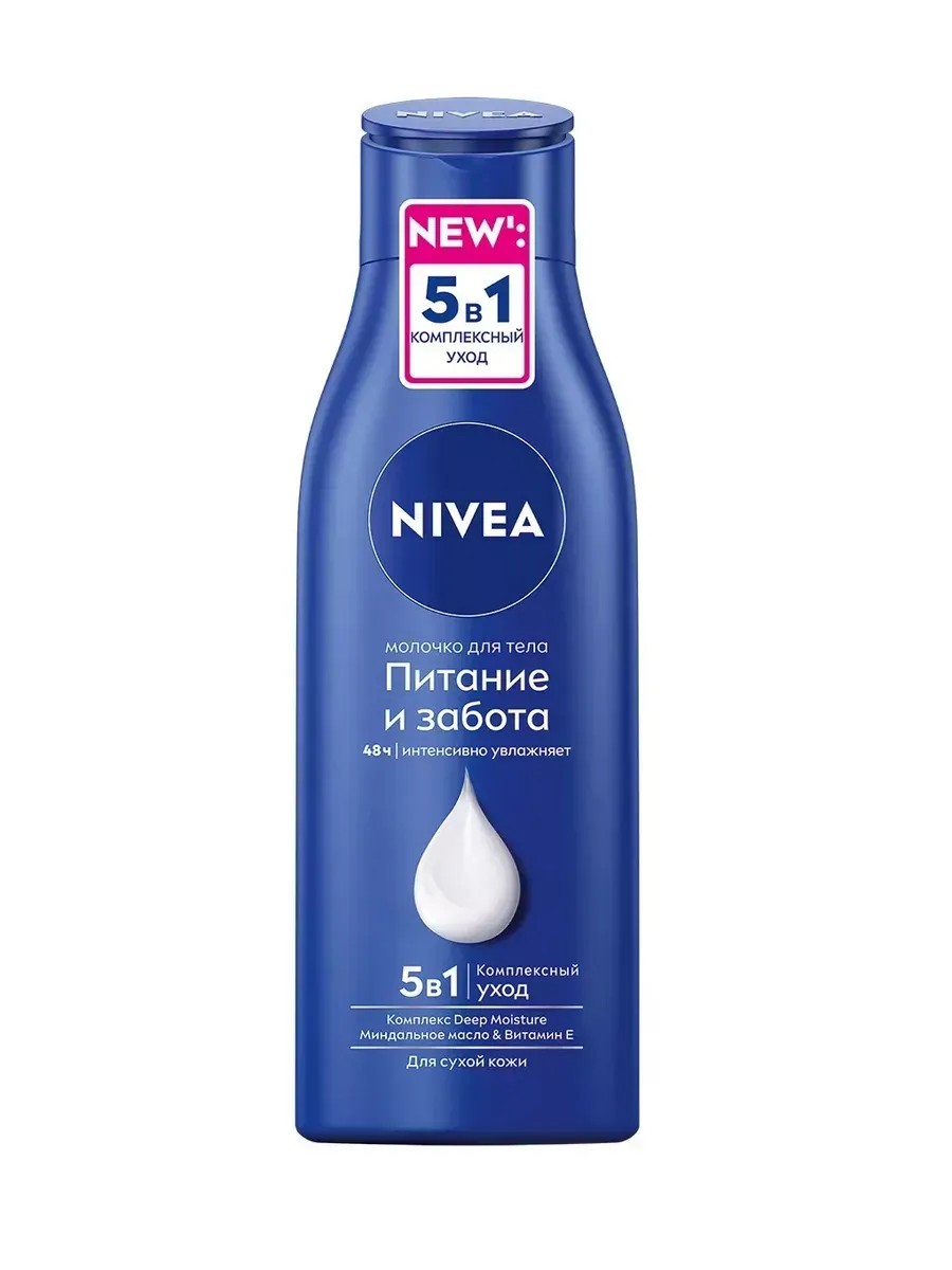 ашей коже необходимо срочное увлажнение и уход? Попробуйте молочко для тела «Питание и забота» от NIVEA для сухой кожи. Молочко для тела «Питание и забота» с комплексом Deep Moisture (Глубокое Увлажнение), миндальным маслом и витамином Е для комплексного ухода 5в1: 48 часов интенсивного увлажнения, ощущение гладкости кожи, естественное сияние, ощущение мягкости кожи, приятный аромат. Используй ежедневно как лосьон для тела. Дерматологически протестировано. Применение: немного средства налить в ладони и втирать в очищенную сухую кожу круговыми массажными движениями, распределяя по всему телу. Не стоит использовать сразу большое количество, лучше добавлять продукт постепенно по мере необходимости. Наносите молочко ежедневно на все тело, уделяя особое внимание наиболее сухим участкам.