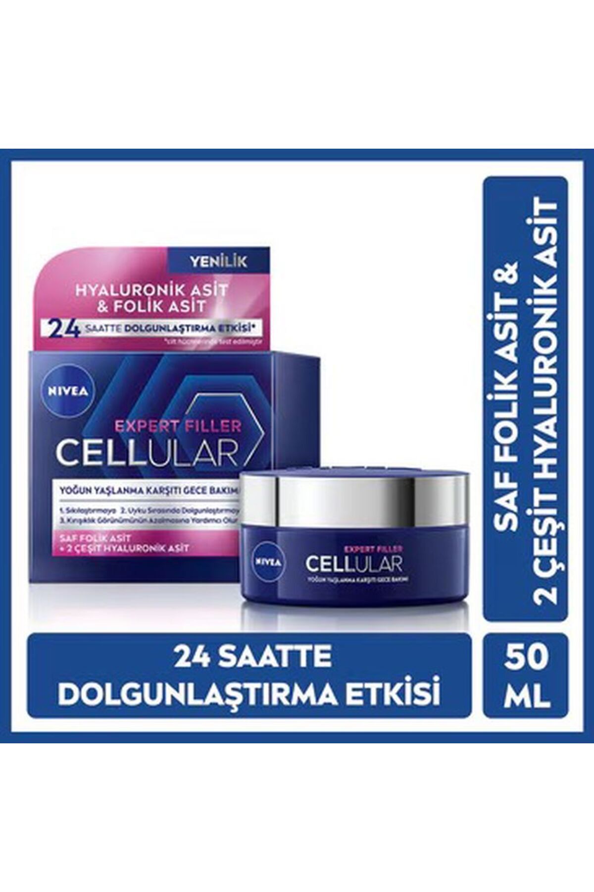 • NIVEA Cellular Expert Filler Sikilastirici Yaslanma Karsiti Gece Yüz Bakim Kremi, yogun gece yüz bakim kremi sikilastirmaya, uyku sirasinda dolgunlastirmaya ve kirisiklik görünümünün azalmasina yardimci olur. Gelismis formülü dolgunlastirma etkisini 24 saatte gösteren güçlü yaslanma karsiti içeriklerin bir kombinasyonunu içerir. Daha genç görünen bir cilt için sikilik kaybina karsi savasir. SAF FOLIK ASIT, cildin canlanmasina yardimci olur. Cilt dokusuna pürüzsüz bir görünüm verir.