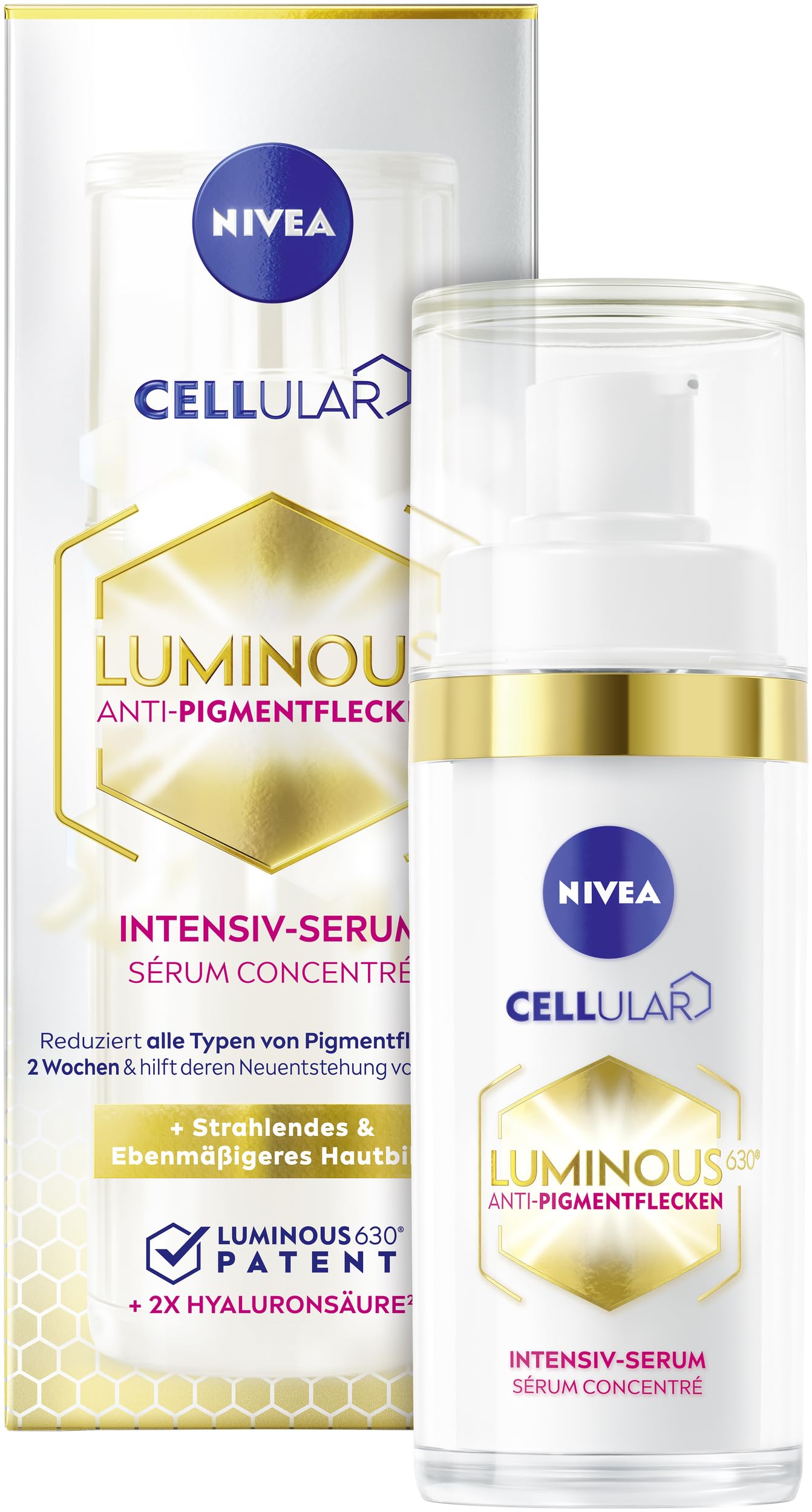 NIVEA Cellular LUMINOUS630 Intensive Anti-Digital Spot Serum - Reduces all types of pigment spots After 10 years of intensive research and testing of more than 50,000 ingredients, NIVEA has developed a new, highly effective agent for reducing pigment spots: the active ingredient LUMINOUS630. For even, radiant skin, the lightweight Cellular LUMINOUS630 anti-pigment spot serum reduces all types of pigment spots in 2 weeks due to the sun, skin aging or hormonal changes such as pregnancy or menopause. In addition, the facial serum prevents their new emergence. The formula is enriched with 2 times the amount of hyaluronic acid and intensely hydrates the skin. The serum is gentle on the skin and suitable for all skin types, including sensitive skin. LUMINOUS630 works equally on all skin tones. For naturally uniform and radiant skin: NIVEA Cellular LUMINOUS630 intense anti-pigment spot serum. Use : Apply the intensive serum morning and evening to cleansed skin before your usual facial care routine. For optimal results in the morning after serum, apply Fluid Day Cream SPF 50 LUMINOUS630. Products from the LUMINOUS630 max care series. Use 4 times a day. Avoid contact with eyes. Product benefits in detail: Intensive anti-pigment spot serum With the innovative patented active ingredient LUMINOUS630 Acts against the 3 types of pigment spots For all skin types, even sensitive skin Compared to the previous formula of the LUMINOUS630 intensive serum. INGREDIENTS Aqua,Isopropyl Palmitate,Cetearyl Isononanoate,Dimethicone,Glycerin,Alcohol Denat.,Cocoglycerides,Distarch Phosphate,Butylene Glycol,Methylpropanediol,Tapioca Starch,Isobutylamido Thiazolyl Resorcinol,Sodium Hyaluronate,Tocopherher,Tocopherher,Sodium Hyaluronate,Tocopherher,Tocopherhero yl acetate, Stearyl Alcohol, Cetyl Alcohol, Glyceryl Stearate, Sodium Ascorbyl Phosphate, Sodium Stearoyl Glutamate, Sodium Acrylate, Acrylate C10-30 Alkyl Acrylate Crosspolymer, Trisodium EDTA, Sodium Chloride, Sodium Hydroxide, Sodium Sulfate, phenoxyethane. ol,benzyl. Cohol, perfume, CI 15985, CI 47005 SAFETY WARNING Avoid direct contact with eyes. Contents and details: NIVEA Luminous Anti Pigment Intensive Serum 30 ml, Anti-pigment serum, gentle on skin with dermatologically confirmed skin compatibility, item number 94429. Improved formula - The formula of the anti-pigment serum is enriched with 2 times the amount of hyaluronic acid and intensively moisturizes the skin. Triple action - The serum reduces pigment spots caused by the sun, skin aging or hormonal changes and prevents their recurrence. PATENTED ACTIVE INGREDIENT - After 10 years of intensive research, NIVEA has developed the highly effective active ingredient LUMINOUS630 to reduce and lighten pigment spots. Highly effective formula - The NIVEA face serum reduces all types of pigment spots within 2 weeks for naturally even and radiant skin. NIVEA Cellular LUMINOUS630 Sérum Intensif Anti-taches pigmentaires - Réduit tous les types de taches pigmentaires Après 10 ans de recherches intensives et de tests de plus de 50 000 ingrédients, NIVEA a mis au point un nouvel agent hautement efficace pour réduire les taches pigmentaires : l'ingrédient actif LUMINOUS630. Pour une peau uniforme et éclatante, le sérum léger Cellular LUMINOUS630 anti-taches pigmentaires réduit tous les types de taches pigmentaires en 2 semaines dues au soleil, au vieillissement cutané ou aux changements hormonaux tels que la grossesse ou la ménopause. En outre, le sérum pour le visage prévient leur nouvelle émergence. La formule est enrichie en 2 fois la quantité d'acide hyaluronique et hydrate intensément la peau. Le sérum est doux pour la peau et convient à tous les types de peau, y compris les peaux sensibles. LUMINOUS630 agit également sur tous les tons de peau. Pour une peau naturellement uniforme et éclatante : sérum intense anti-taches pigmentaires NIVEA Cellular LUMINOUS630. Utilisation : Appliquer le sérum intensif matin et soir sur une peau nettoyée avant la routine habituelle du soin du visage. Pour des résultats optimaux le matin après le sérum, appliquer la crème de jour Fluid FPS 50 LUMINOUS630. Les produits de la série de soins LUMINOUS630 max. Utiliser 4 fois par jour. Éviter tout contact avec les yeux. Les avantages du produit en détail : Sérum intensif anti-taches pigmentaires Avec l'ingrédient actif innovant breveté LUMINOUS630 Agit contre les 3 types de taches pigmentaires Pour tous les types de peaux, même les peaux sensibles Par rapport à la formule précédente du sérum intensif LUMINOUS630. INGRÉDIENTS Aqua,Isopropyl Palmitate,Cetearyl Isononanoate,Dimethicone,Glycerin,Alcohol Denat.,Cocoglycerides,Distarch Phosphate,Butylene Glycol,Methylpropanediol,Tapioca Starch,Isobutylamido Thiazolyl Resorcinol,Sodium Hyaluronate,Tocopherher,Tocopherher,Sodium Hyaluronate,Tocopherher,Tocopherhero yl acétate, Alcool stéarylique, alcool cétylique, stéarate de glycéryle, phosphate d'ascorbyle de sodium, stéaroyl glutamate de sodium, acrylate de sodium, acrylate C10-30 alkyl acrylate Crosspolymère, Trisodium EDTA, chlorure de sodium, hydroxyde de sodium, sulfate de sodium, phénoxyéthane. ol,benzyle. Cohol, parfum, CI 15985, CI 47005 AVERTISSEMENT DE SÛRETÉ Éviter le contact direct avec les yeux. Contenu et détails : sérum NIVEA Luminous Anti Pigment Intensif 30 ml, Sérum anti-taches pigmentaires, doux pour la peau avec une tolérance cutanée confirmée dermatologiquement, numéro d'article 94429. Formule améliorée - La formule du sérum anti-taches pigmentaires est enrichie avec 2 fois la quantité d'acide hyaluronique et hydrate intensément la peau. Triple action – Le sérum réduit les taches pigmentaires causées par le soleil, le vieillissement cutané ou les changements hormonaux et prévient leur réapparition. ACTIF BREVETÉ - Après 10 ans de recherche intensive, NIVEA a développé l'ingrédient actif très efficace LUMINOUS630 pour réduire et éclaircir le