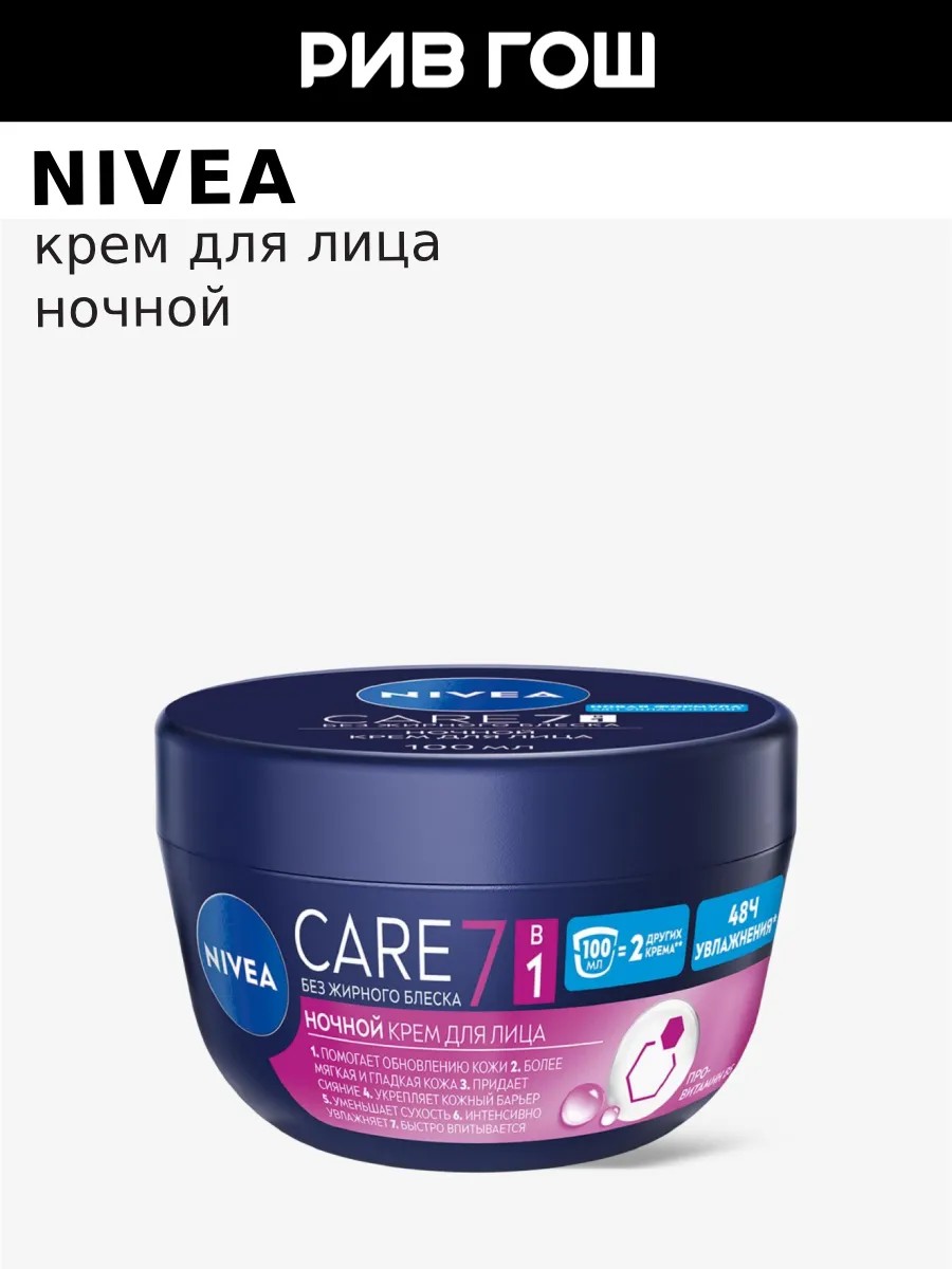 Ночной крем Care для лица от NIVEA 7в1 – интенсивное увлажнение и сияющая кожа. Откройте секрет увлажненной и сияющей кожи с ночным кремом для лица NIVEA 7в1! Его формула с провитамином В5 обеспечивает интенсивное увлажнение до 48 часов*, помогая уменьшить сухость и укрепить кожный барьер. Крем обновляет и восстанавливает кожу, делая ее мягкой и гладкой, а также придает естественное сияние. Легкая текстура быстро впитывается, не оставляя жирного блеска, а экономичный объем 100 мл, равный 2 другим кремам** позволяет наслаждаться кремом дольше.