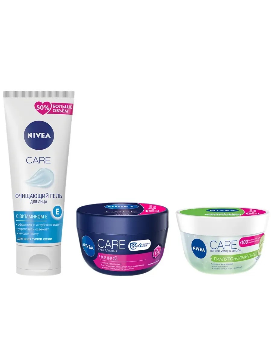 Nivea, гель для умывания Care Очищающий с витамином Е, 225 мл, гиалуроновый гель Care для лица, увлажняющий, 100 мл и крем для лица Care, ночной, 100 мл. Гель для умывания с витамином Е для всех типов кожи обладает мягкой формулой для бережного и эффективного очищения кожи, легко пенится, смывает макияж и не сушит кожу. Попробуйте гиалуроновый увлажняющий гель с гиалуроновой кислотой и огурцом - легкий уход за лицом. В 100 раз легче текстуры обычного крема. Подходит для нормальной и смешанной кожи. Ночной крем для лица с провитамином B5 быстро впитывается без ощущения липкости, интенсивно питает, успокаивает и помогает восстановлению кожи. Подходит для всех типов кожи.