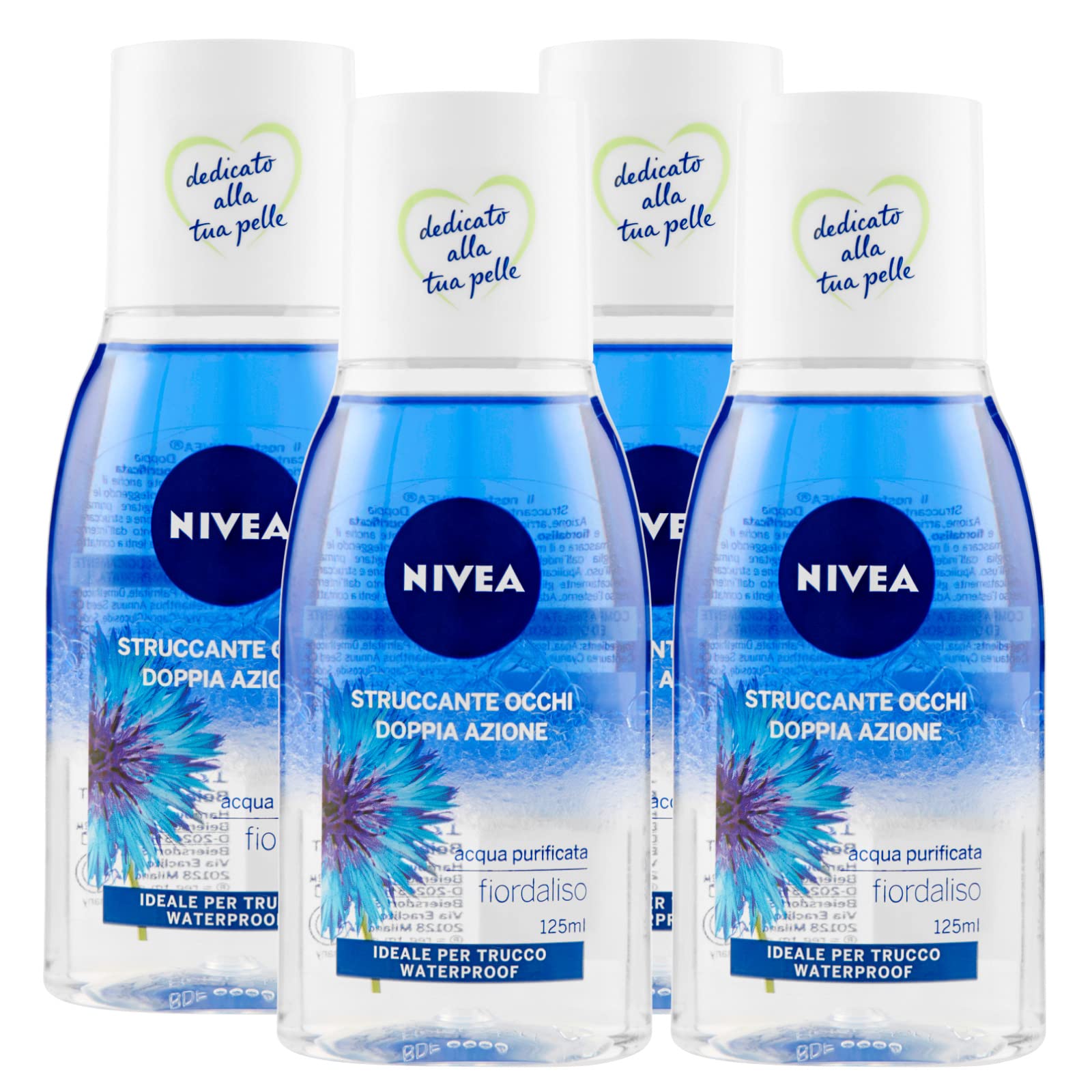 Nivea Démaquillant double yeux avec de l'eau purifiée et des extraits de bleuet waterproof, 4 flacons de 125 ml