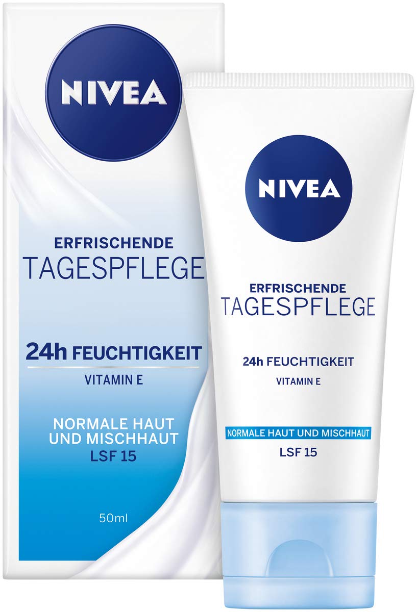 24-hour moisture the facial care cream provides intensive care with every application and helps the skin retain moisture for a long time. INGREDIENTS Vintamine EPractical delivery - Nivea Essentials day care 24 hours moisture freshness for normal and combination skin in 1 package, 1 x 50 ml tube, item number 81152. Fresh skin care - the cream for the face provides a pleasantly soft skin feeling and particularly well-groomed and healthy-looking skin. SPF 15 – due to the protection factor 15 and UVA filter, the moisturizer protects against external influences and premature skin aging due to light. 24 hours of moisture The facial care cream provides intensive care with every application and helps the skin to retain moisture for a long time. Nourishing facial cream – with vitamin E and antioxidants, the Nivea skin cream ensures gently cared for, fresh and healthy facial skin.Nivea dagcrème voor 24 uur vocht frisse moisturizer met SPF 15, dagcrème voor normale gemengde huid (1 x 50 ml) 24 uur vocht de gezichtsverzorgende crème verzorgt bij elke toepassing intensief en helpt de huid om het vocht langdurig op te slaan. INGREDIËNTEN Vintamine EPraktische levering – Nivea Essentials dagverzorging 24 uur vocht frisheid voor normale en gemengde huid in 1 verpakking, 1 x 50 ml tube, artikelnummer 81152. Frisse huidverzorging – de crème voor het gezicht zorgt voor een aangenaam zacht huidgevoel en bijzonder verzorgde en gezond uitziende huid. SPF 15 – door de beschermingsfactor 15 en UVA-filter beschermt de vochtinbrengende crème tegen invloeden van buitenaf en voortijdige huidveroudering door licht. 24 uur vocht de gezichtsverzorgende crème verzorgt bij elke toepassing intensief en helpt de huid om het vocht langdurig op te slaan. Verzorgende gezichtscrème – met vitamine E en antioxidanten zorgt de Nivea huidcrème voor zacht verzorgde, frisse en gezonde gezichtshuid.