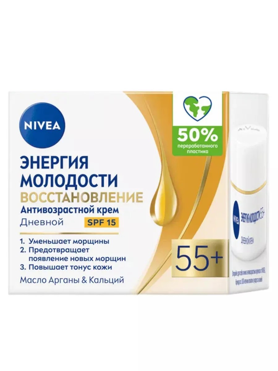 Nivea, крем дневной, Энергия Молодости 55+, 50 мл. Дневной крем Энергия Молодости 55+ эффективно борется с морщинами, интенсивно увлажняет кожу и повышает упругость. Крем обогащен энергетическим коктейлем из Масла Абрикосовых косточек и Убихинона, активного ингредиента, который содержится в клетках кожи.