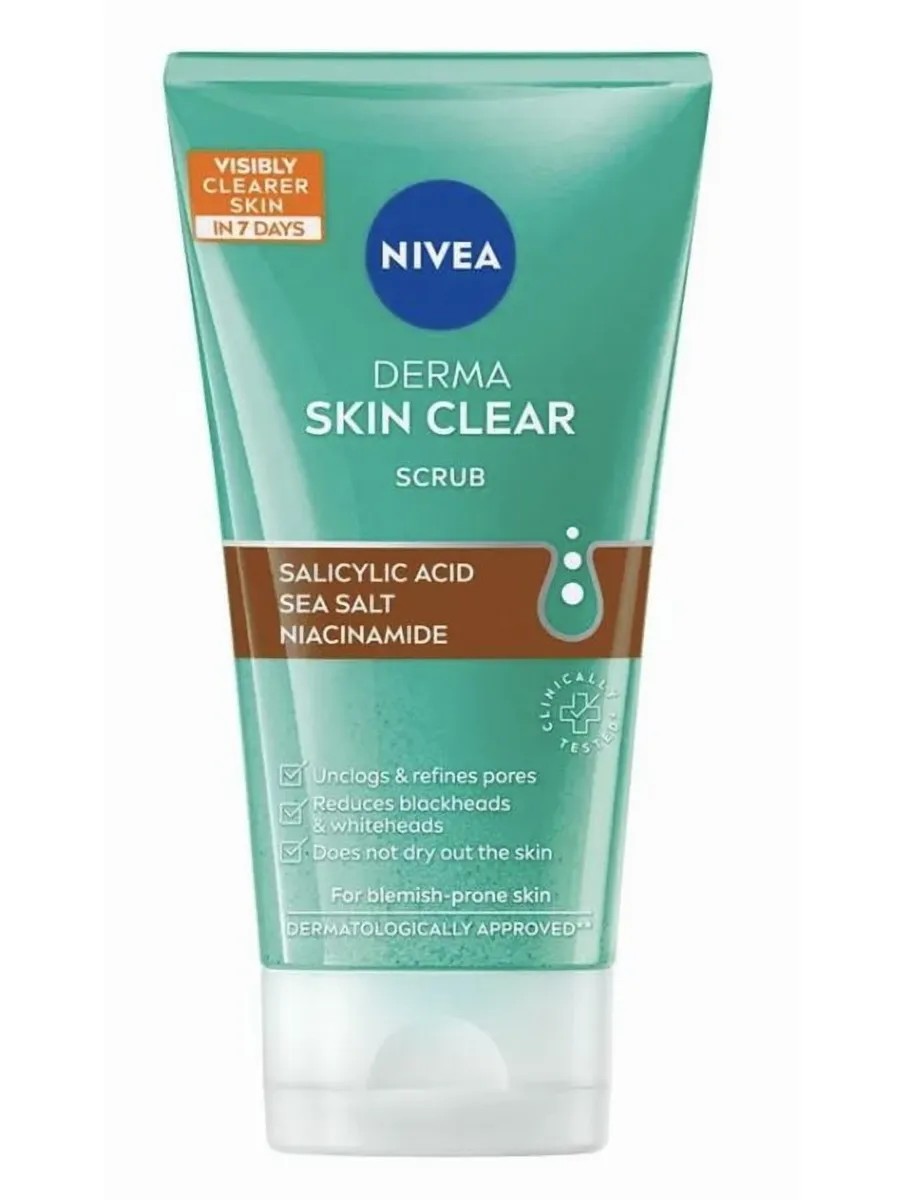 Уменьшает количество черных и белых угрей, очищает поры и улучшает текстуру кожи. Содержит салициловую кислоту, морскую соль и ниацинамид для ухода за кожей, склонной к появлению прыщей.\n\nЭффективность для кожи, склонной к появлению прыщей, подтверждена клиническими исследованиями. Очищает и сужает поры. Не пересушивает кожу. Делает кожу заметно более чистой за 7 дней. Совместимость с кожей одобрена дерматологами.\n\nХотите вернуть контроль над своей кожей? Используйте скраб 2-3 раза в неделю в рамках процедуры Derma Skin Clear.\n\n**Характеристики:**\n\n* Тип: Пилинг\n* Бренд: Nivea\n* Вид пилинга: Салициловый\n* Тип кожи: Для всех типов кожи\n* Область использования: Шея, Лицо\n* Целевая аудитория: Взрослая\n* Единиц в одном товаре: 1\n* Объем: 150 мл\n* Страна-изготовитель: Германия