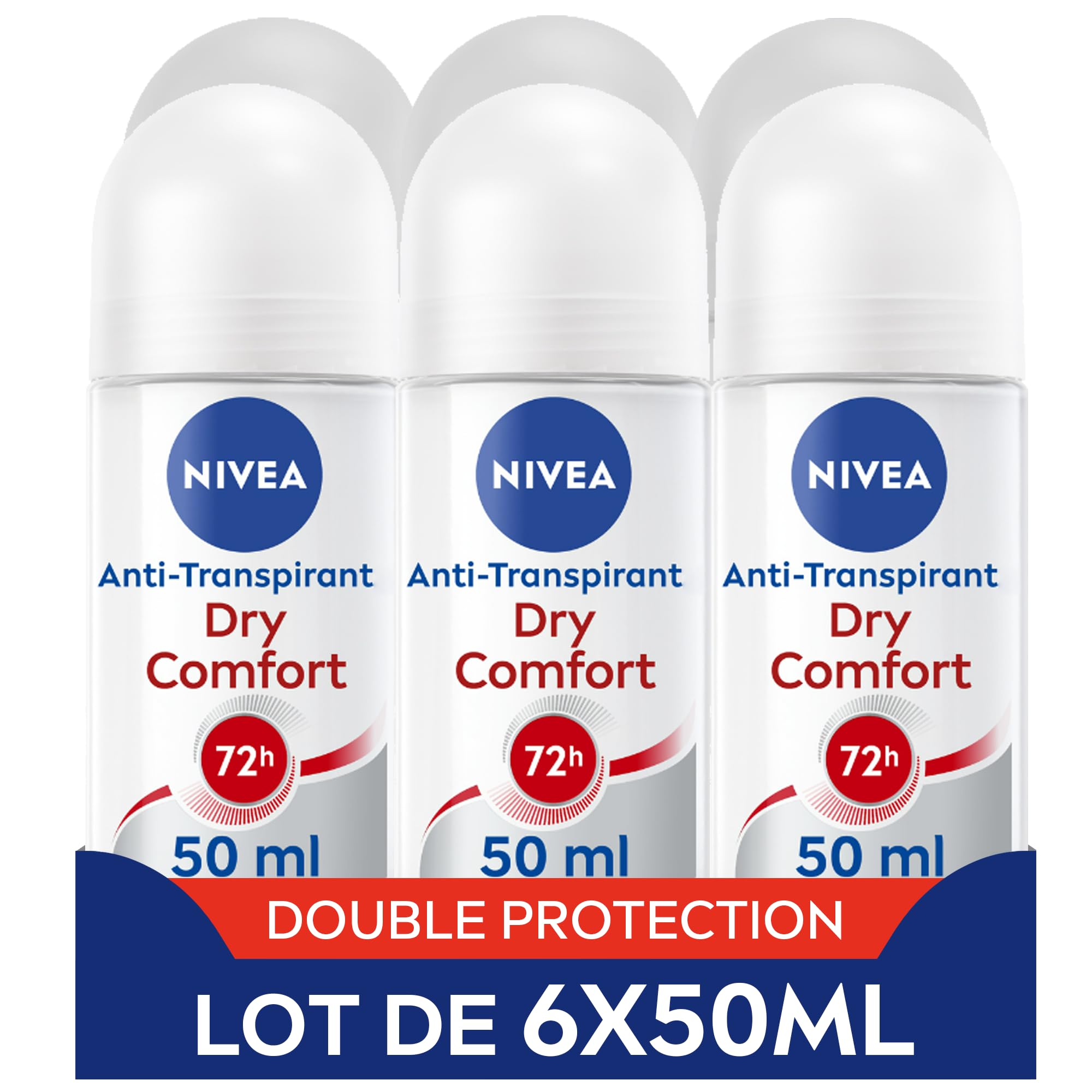 NIVEA Dry Comfort Antiperspirant Deodorant – Antiperspirant protection for 100 freshness Stay fresh for 72 hours with Dry Comfort antiperspirant deodorant! This roll-on deodorant with an alcohol-free formula and antibacterial agents provides long-lasting freshness. It inhibits the growth of odor-causing bacteria. This women's deodorant is suitable for all skin types. Apply the roll-on deodorant to clean, dry underarm skin. Let it dry before getting dressed. The benefits of this roll-on deodorant: Antiperspirant deodorant 72H effectiveness Alcohol-free formula Fights the growth of odor-causing bacteria Convenient roll-on format Contents: 6 x 50 ml DIRECTIONS FOR USE Apply the roll-on deodorant to clean, dry underarm skin. Let it dry before getting dressed.Packaging – NIVEA Antiperspirant Deodorant Dry Comfort, Roll-On with alcohol-free antiperspirant formula, Women's Deodorant 72H Protection 6 x 50 ml. Directions for use – Apply this protective deodorant to clean, dry underarm skin. Do not use on irritated or damaged skin. Alcohol-free – The alcohol-free formula of this mineral-enriched NIVEA deodorant prevents any risk of irritation. This product is suitable for all skin types. 72H Protection – This protective deodorant provides 72H protection against perspiration and unpleasant odors linked to the growth of bacteria. Antiperspirant protection – This women's deodorant provides deodorant and antiperspirant protection while caring for sensitive underarm skin. NIVEA Déodorant anti-transpirant Dry Comfort – Protection antitranspirante pour 100 de fraîcheur Avec le déodorant anti-transpirant Dry Comfort, restez fraîche durant 72 h ! Ce déodorant bille à la formule sans alcool et aux agents antibactériens offre une fraicheur longue durée. Il empêche le développement des bactéries responsables des mauvaises odeurs. Ce déo femme convient à tous les types de peaux. Appliquez le déodorant bille sur la peau propre et sèche des aisselles. Laissez sécher avant de vous habiller. Les bénéfices de ce déodorant bille : Déo antitranspirant anti odeurs Efficacité 72H Formule sans alcool Lutte contre le développement des bactéries responsables des mauvaises odeurs Format bille pratique Contenu : 6 x 50 ml MODE D'EMPLOI Appliquez le déodorant bille sur la peau propre et sèche des aisselles. Laissez sécher avant de vous habiller.Emballage – NIVEA Déodorant anti-transpirant Dry Comfort, Roll-On à la formule antitranspirante sans alcool, Déo femme protection 72H 6 x 50 ml. Conseils d'application – Appliquez ce déo protecteur sur la peau propre et sèche des aisselles. Ne pas utiliser sur une peau irritée ou abîmée. Sans alcool – La formule sans alcool de ce déo NIVEA enrichi en minéraux évite tout risque d'irritation. Ce produit convient à tous les types de peaux. Protection 72H – Ce déo protecteur offre une protection de 72H contre la transpiration et les mauvaises odeurs liées à la prolifération des bactéries. Protection anti-transpirante – Ce déo pour femme assure une protection déodorante et anti-transpirante tout en prenant soin de la peau sensible des aisselles.