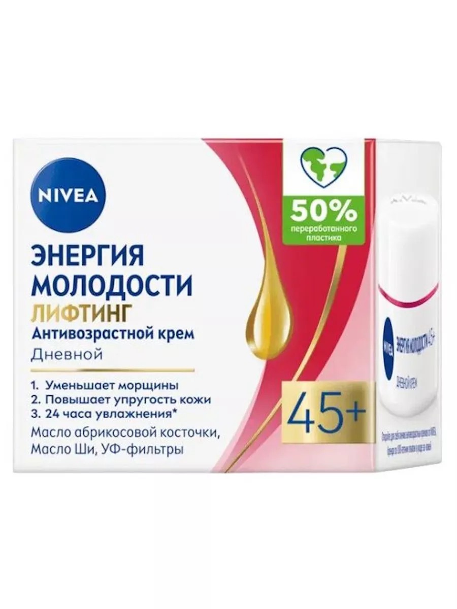 Nivea Youth Energy 45+ Day Face Cream, 50 ml. Facial skin is exposed daily to external factors such as climate, sunlight, dust, and pollution. All of these factors can cause changes in its condition, including dryness, unwanted pigmentation, premature aging, and wrinkles. To combat these negative effects, Nivea experts have created the anti-aging daily face cream, Nivea Youth Energy + Lifting 45+. It firms the skin and provides intense hydration. Enriched with an energetic cocktail of apricot kernel oil and ubiquinone, an active ingredient naturally found in skin cells, the cream visibly reduces fine lines and wrinkles. Apricot kernel oil provides long-lasting, intense hydration. Used daily, it imparts a healthy glow. Ingredients: aqua, glycerin, butyrospermum parkii butter, cetearyl alcohol, ethylhexyl salicylate, methylpropanediol, alcohol denat., glyceryl stearate se, butyl methoxydibenzoylmethane, octocrylene, c12-15 alkyl benzoate, caprylic/capric triglyceride, hydrogenated coco-glycerides, phenylbenzimidazole sulfonic acid, prunus armeniaca kernel oil, tocopheryl acetate, ubiquinone, carbomer, xanthan gum, trisodium edta, ethylhexylglycerin, sodium hydroxide, phenoxyethanol, parfum