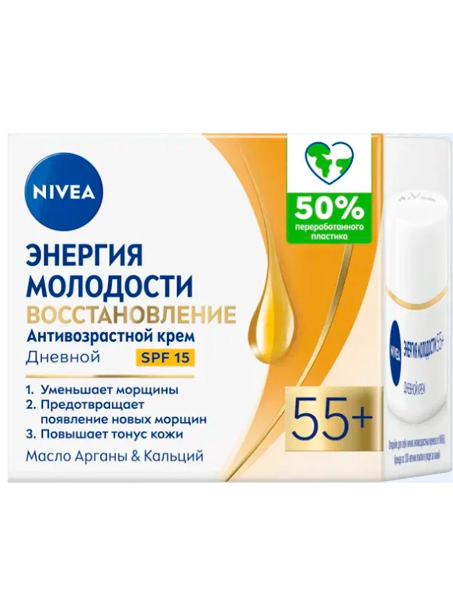 Откройте для себя линию антивозрастных кремов «Энергия Молодости» NIVEA, бренда со 100-летним опытом в уходе за кожей. Дневной крем "Энергия Молодости" Восстановление 55+ NIVEA заметно сокращает морщины, повышает тонус требовательной зрелой кожи и повышает устойчивость кожи к обезвоживанию. В составе содержатся масло арганы, кальций, а также УФ-фильтры, которые защищают кожу и предотвращают появление новых морщин.