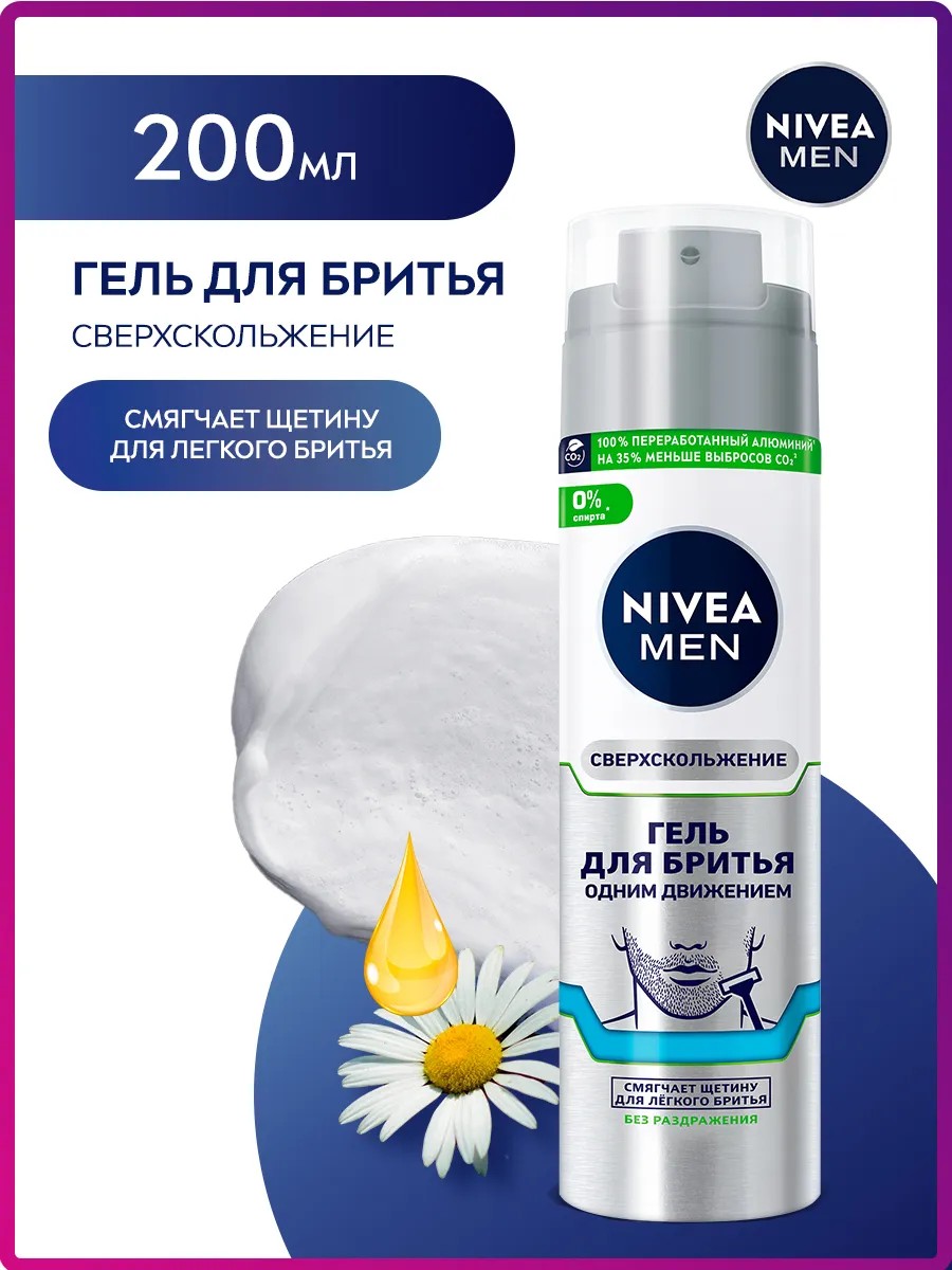"Гель для бритья одним движением «Сверхскольжение» для чувствительной кожи без спирта* от NIVEA MEN смягчает щетину для легкого срезания волосков и скольжения во время бритья. Помогает сбрить даже отросшую щетину одним движением. Дерматологически протестировано. Гель для бритья «Сверхскольжение» разработан специально для мужчин с чувствительной кожей. Рекомендуется дополнить уход, используя бальзам или лосьон после бритья из успокаивающей линейки для чувствительной кожи от NIVEA MEN. Применение: Нанесите гель для бритья на влажную кожу лица. Побрейтесь и умойтесь водой, после чего налейте небольшое количество средства после бритья в ладонь, нанесите на лицо и шею после бритья аккуратными массирующими движениями, избегая области вокруг глаз.