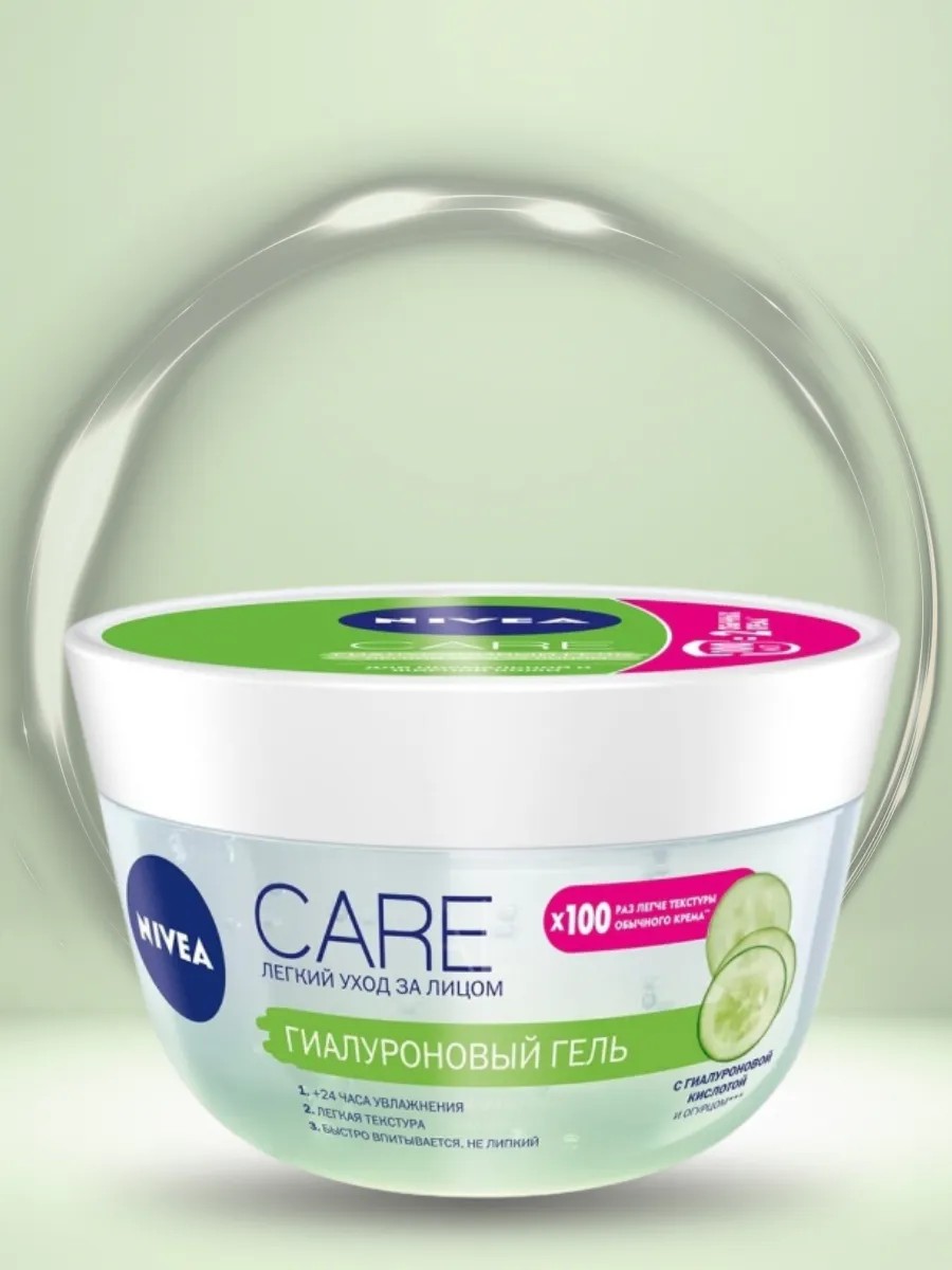 Попробуйте гиалуроновый увлажняющий гель от NIVEA с гиалуроновой кислотой и огурцом* - легкий уход за лицом. В 100 раз легче текстуры обычного крема**. Подходит для нормальной и комбинированной кожи. Большой объем крема 100 мл (в два раза больше, по сравнению с кремами для лица NIVEA в объеме 50 мл.) – хватит надолго даже при ежедневном использовании. Дерматологически протестировано. Применение: небольшое количество средства нанести в небольшом количестве на чистую кожу лица, шеи и зоны декольте мягкими массирующими движениями в течение 1-2 минут до полного впитывания. Попробуйте дополнить свой ежедневный уход, используя гель для умывания CARE и нежный тоник для лица от NIVEA, а также ночной крем CARE. *с огуречным соком и гиалуронатом натрия **По сравнению с увлажняющим кремом для лица NIVEA CARE