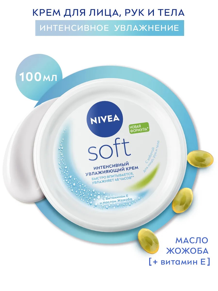 | Полное наименование товара | Интенсивный увлажняющий крем NIVEA Soft для лица, рук и тела с маслом жожоба и витамином Е, 100 мл |