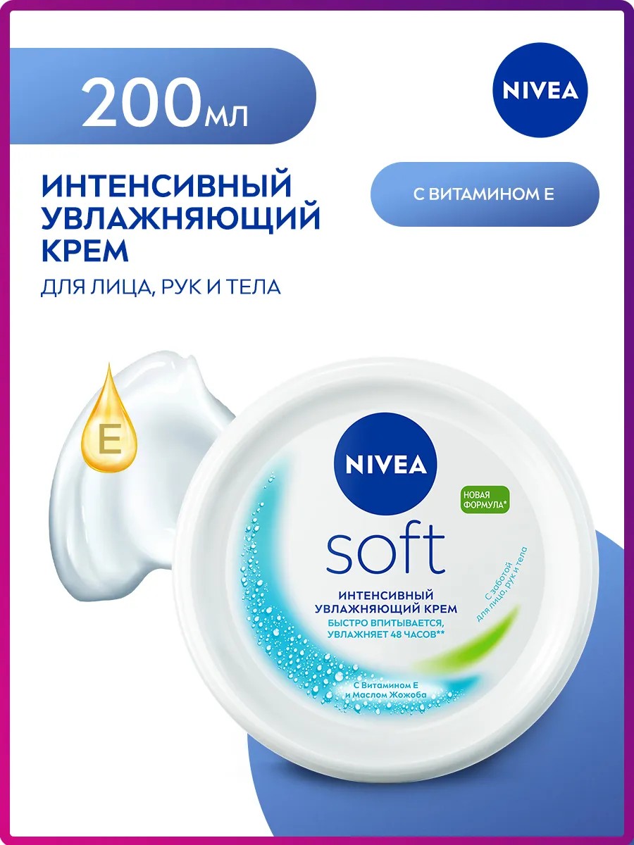 Так приятно, когда находишь средство, идеально подходящее не только для кожи рук, но и для тела и лица! Попробуйте интенсивный увлажняющий крем Soft от NIVEA для всех типов кожи. Он был разработан для ежедневного ухода за кожей лица, рук и тела. С заботой для лица, рук и тела. Формула с витамином Е и маслом жожоба обладает легкой текстурой, быстро впитывается и увлажняет 48 часов. Крем Soft с унисекс (универсальным) ароматом могут использовать как женщины, так и мужчины. Дерматологически протестировано. Применение: нанесите небольшое количество крема на сухую чистую кожу лица, рук и тела аккуратными массирующими движениями. Повторяйте нанесение по мере необходимости.