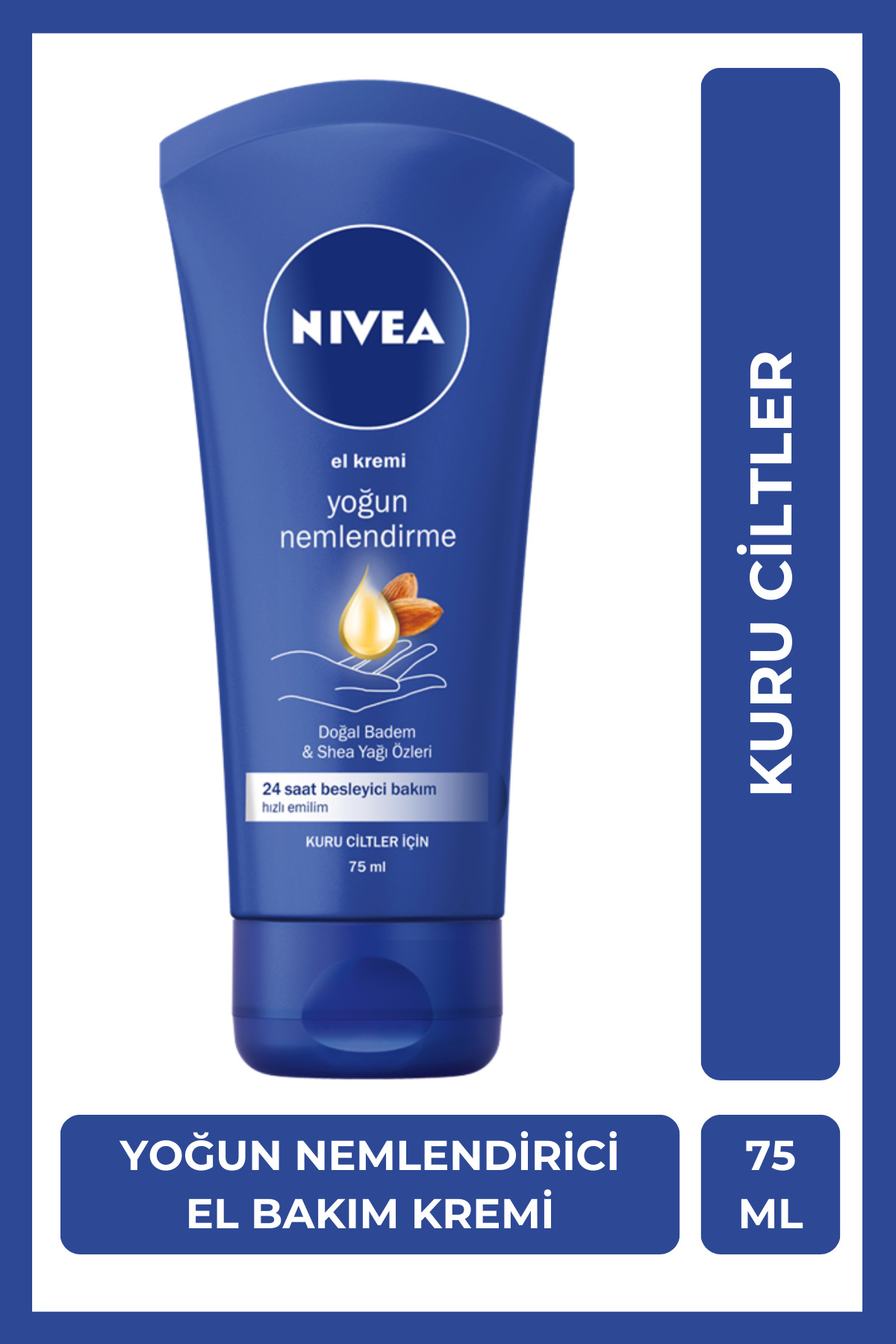 • 100 yillik cilt bakim uzmani NIVEA'dan NIVEA Yogun Nemlendirici El Kremi, içerigindeki dogal badem yagi ve shea yagi özleri sayesinde ellerinizi korur ve bakim yapar.