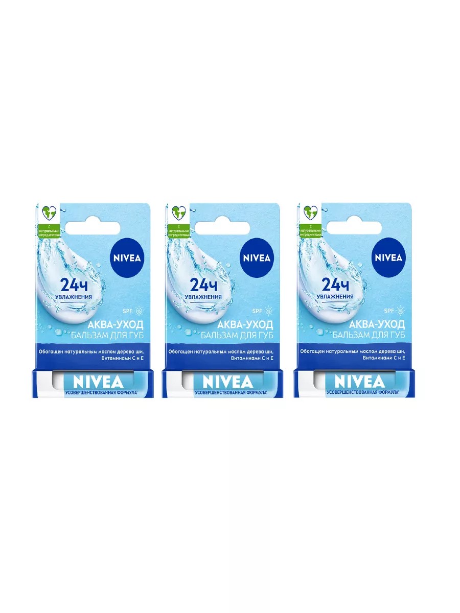 Nivea, Бальзам для губ Аква-уход SPF 15 4.8 мл. Комплект 3 шт. Легкая водостойкая формула бальзама для губ мгновенно тает на губах, придавая мягкость и гладкость, защищает губы от мороза и ветра, а наличие фактора защиты SPF 15 предохраняет от воздействия UVA/UVB излучения. Подходит для использования в любое время года, особенно в сухой летний период или холодный зимний. Гигиеническая помада ухаживает за губами, придавая им более гладкий и увлажненный вид. Натуральные масла и витамины в составе. Дерматологически протестировано. Способ применения: наносите бальзам на чистую и сухую кожу губ, обновляйте бальзам на губах по мере необходимости и в зависимости от состояния кожи губ.