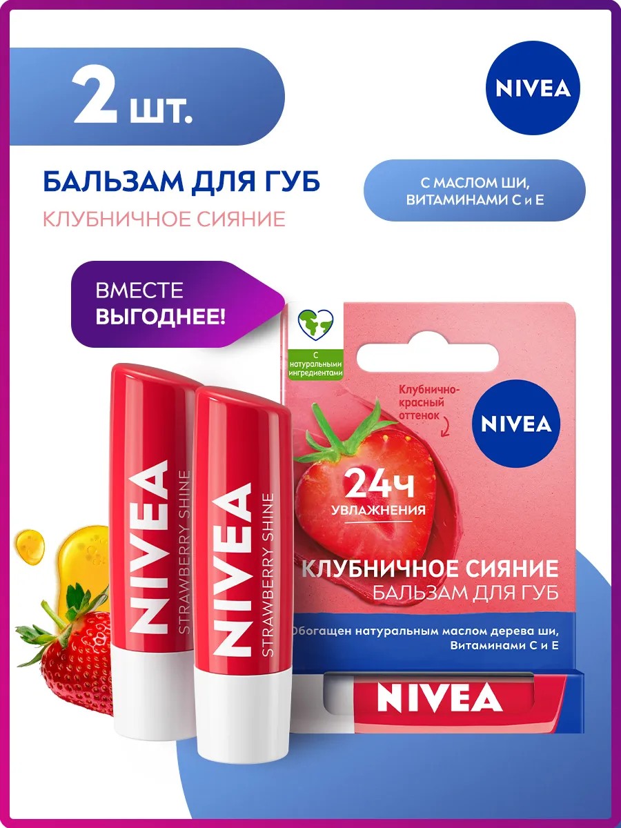 "Притягательный аромат, соблазнительный оттенок, уход в одной помаде. Бальзам для губ ""Клубничное сияние"" от NIVEA придает красивый клубнично-красный оттенок и великолепный аромат свежей клубники, сохраняя губы мягкими и нежными. Гигиеническая помада ухаживает за губами, придавая им более гладкий и увлажненный вид. Усовершенствованная' ухаживающая формула с натуральным маслом дерева ши и витаминами С и Е мгновенно тает на губах, придавая гладкость, защищая от мороза, ветра и сухости. Увлажнение 24 часа*. Подходит для использования в любое время года, особенно в весенне-летний период для естественного сияния и легкого увлажнения. Натуральные масла и витамины в составе. Дерматологически протестировано. Без ингредиентов животного происхождения. Способ применения: наносите бальзам на чистую и сухую кожу губ, обновляйте бальзам на губах по мере необходимости и в зависимости от состояния кожи губ.