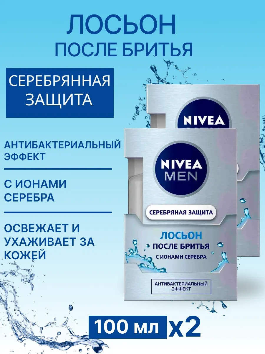 Попробуй лосьон после бритья «Серебряная защита» с ионами серебра для всех типов кожи от NIVEA MEN. Формула лосьона после бритья с ионами серебра, экстрактом ромашки и про-витамином B5: обеспечивает антибактериальную защиту, предотвращая раздражение кожи после бритья, освежает и ухаживает за кожей. Быстро впитывается. Дерматологически протестировано.