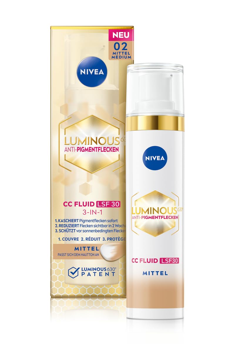 Nivea Luminous 630 Anti-pigment spots CC Fluid-for an even & radiant skin with flawless complexion The Luminous 630® anti-pigment spots CC Fluid with SPF 30 ensures radiant skin and perfects the complexion thanks to 3-in-1 effect: 1. concealed: micro -maped color pigments in the moisture cream that adapt to the skin tone immediately give a natural, even complexion and the same pigment spots and unevenness. 2. Reduced: The light, silky formula of the face cream with Luminous630® visibly reduces pigment spots in 2 weeks and compensates for the complexion by + 40% in 8 weeks.* 3. Protects: The formula of Nivea cream with SPF 30 protects against UV rays and prevents the new development of pigment spots. With cell -activating ** hyaluronic acid, the face cream also supplies the skin with moisture and pushing it up. The innovation after 10 years of research: After 10 years of intensive research, Nivea has developed the highly effective, patented active ingredient Luminous 630® to reduce pigment spots and prevent their new formation. Application: Apply to the cleaned face every day.For ideal results, use the Luminous 630 ® intensive serum in front of the fluid. Luminous 630 ® facial care products do not use more than 4x a day.Avoid direct eye contact. *Self-rating, 12-week study with 51 women, 2023 ** tested on skin cells "" Warnings Avoid direct eye contact.delivery & details-Nivea luminous 630 anti-pigment spots CC Fluid for medium skin tones (40 ml), moisture cream with micro-maped color pigments for radiant skin, article no.86906. Perfected complexion - with microca -capsized color pigments that adapt to the skin tone, the face cream gives a natural, even complexion.3-in-1 effect-the CC fluid pigment spots immediately conceals for even skin, visibly reduces it in 2 weeks and protects against sun-related stains.Patented active ingredient - after 10 years of research and the examination of over 50,000 ingredients, Nivea has developed the patented active ingredient Luminous 630.Luminous 630-The Nivea Luminous anti-pigment spots fluid perfected as a tinted daily cream with hyaluronic acid the complexion thanks to 3-in-effect. "" NIVEA Luminous 630 Anti-Pigmentflecken CC Fluid – für eine ebenmäßige & strahlende Haut mit makellosem Teint Das LUMINOUS 630® Anti-Pigmentflecken CC Fluid mit LSF 30 sorgt für strahlende Haut und perfektioniert den Teint dank 3-in-1-Wirkung: 1. Kaschiert: Mikroverkapselte Farbpigmente in der Feuchtigkeitscreme, die sich dem Hautton anpassen, verleihen einen natürlichen, ebenmäßigen Teint und gleichen Pigmentflecken und Unebenmäßigkeiten sofort aus. 2. Reduziert: Die leichte, seidige Formel der Gesichtscreme mit LUMINOUS630® reduziert Pigmentflecken sichtbar in 2 Wochen und gleicht den Teint in 8 Wochen um + 40% aus.* 3. Schützt: Die Formel der NIVEA Creme mit LSF 30 schützt vor UV-Strahlen und beugt der Neuentstehung von Pigmentflecken vor. Mit zellaktivierender** Hyaluronsäure versorgt die Gesichtscreme die Haut zudem mit Feuchtigkeit und polstert sie auf. Die Innovation nach 10 Jahren Forschung: Nach 10 Jahren intensiver Forschung hat NIVEA den hochwirksamen, patentierten Wirkstoff LUMINOUS 630® entwickelt, um Pigmentflecken zu reduzieren und deren Neuentstehung vorzubeugen. Anwendung: Täglich morgens auf das gereinigte Gesicht auftragen. Für ideale Ergebnisse das LUMINOUS 630 ® Intensiv-Serum vor dem Fluid verwenden. LUMINOUS 630 ® Gesichtspflege-Produkte nicht mehr als 4x am Tag verwenden. Direkten Augenkontakt vermeiden. *Selbsteinstufung, 12-wöchige Studie mit 51 Frauen, 2023 **an Hautzellen getestet "" WARNHINWEISE Direkten Augenkontakt vermeiden.Lieferumfang & Details – NIVEA Luminous 630 Anti-Pigmentflecken CC Fluid für mittlere Hauttöne (40 ml), Feuchtigkeitscreme mit mikroverkapselten Farbpigmenten für strahlende Haut, Artikelnr. 86906. Perfektionierter Teint – Mit mikroverkapselten Farbpigmenten, die sich dem Hautton anpassen, verleiht die Gesichtscreme einen natürlichen, ebenmäßigen Teint. 3-in-1-Wirkung – Für ebenmäßige Haut kaschiert das CC Fluid Pigmentflecken sofort, reduziert diese sichtbar in 2 Wochen und schützt vor sonnenbedingten Flecken. Patentierter Wirkstoff – Nach 10 Jahren Forschung und der Prüfung von über 50.000 Inhaltsstoffen hat NIVEA den patentierten Wirkstoff Luminous 630 entwickelt. Luminous 630 – Das NIVEA Luminous Anti-Pigmentflecken Fluid perfektioniert als getönte Tagescreme mit Hyaluronsäure den Teint dank 3-in-Wirkung.NIVEA Luminous 630 Anti-Pigmentflecken CC Fluid LSF 30 für mittlere Hauttöne, CC Cream mit Hyaluron und mikroverkapselten Farbpigmenten, Tagescreme mit LSF 30 für einen ebenmäßigen Teint (40 ml) Modern 40 ml (1er Pack)