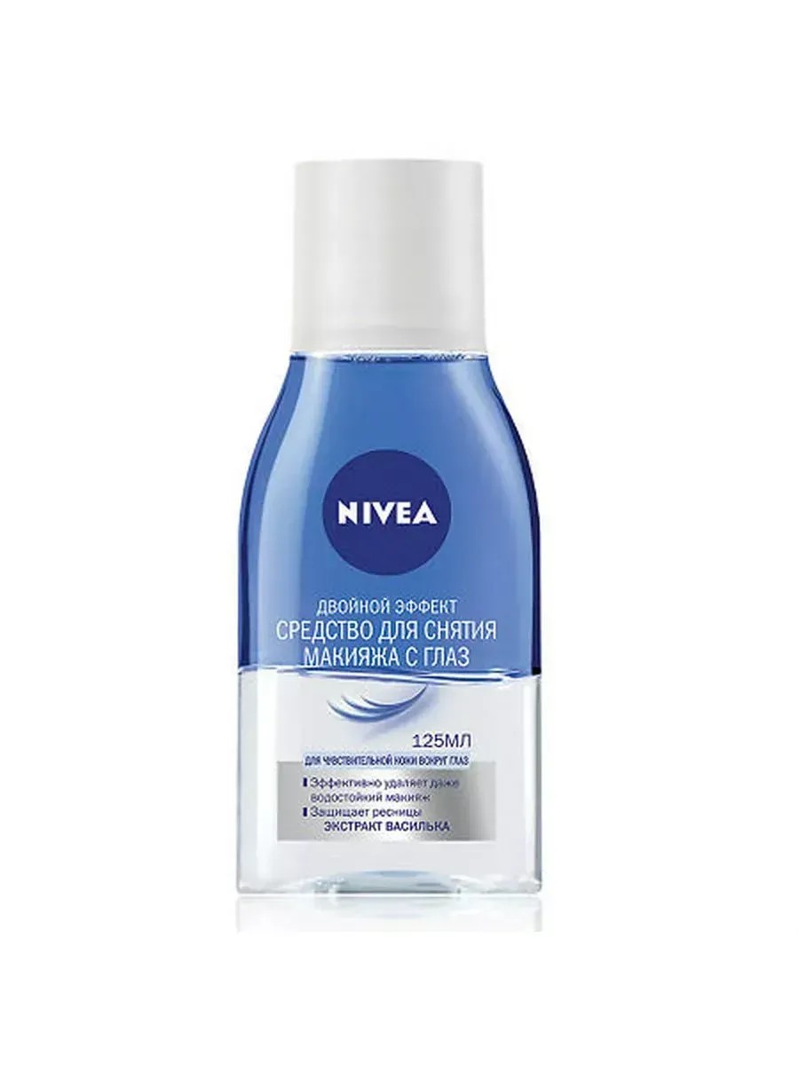 Nivea Double Effect Eye Makeup Remover 125ml. Eye makeup remover - effectively removes waterproof makeup. Two-phase formula with cornflower extract: effectively removes waterproof mascara and cares for lashes and the delicate skin around the eyes. Directions for use: 1. Moisten cotton pads with Double Effect Eye Makeup Remover and apply them firmly to your eyes for 5 seconds; 2. Run the cotton pads over your lashes several times from bottom to top; 3. Run the cotton pad over your eyelid toward the outer corner of your eye. Repeat until mascara is removed from your eyelids and lashes.