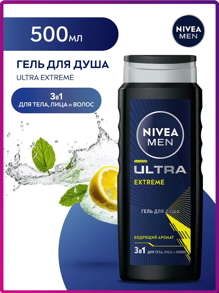 "Ведете активный образ жизни? Попробуйте ароматную новинку*: Гель для душа 3в1 ULTRA EXTREME 500 мл от NIVEA MEN – коктейль мужественности, раскрывающийся во всех ее проявлениях. Взрыв аромата и бодрости, когда он необходим, сохранится даже после занятий спортом. Идеальный баланс между свежестью и силой. Новый аромат дарят мгновенное ощущение свежести и чистоты. Удивительно восточно-пряный аромат зарядит каждый миллиметр тела на новые свершения. Будьте экстремально активными вместе с NIVEA MEN. Дерматологически протестировано. pH сбалансировано**