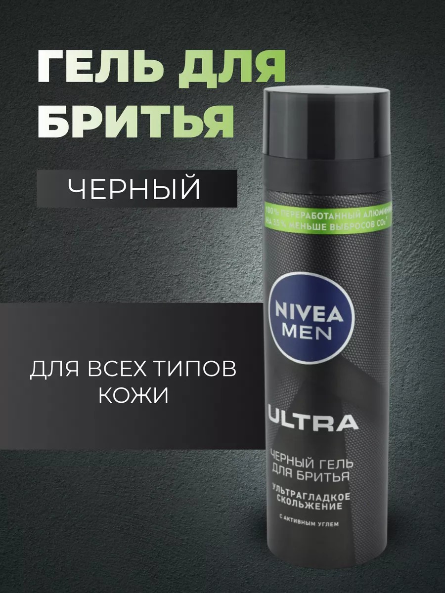 Гель для бритья мужской с активным углем ULTRA MEN 200мл, 1 шт. Косметическая линейка для мужчин от NIVEA MEN - ULTRA. Действительно черный гель для бритья обеспечивает гладкое скольжение лезвия бритвы, а очищающая кожу формула с активным углем обеспечивает свежесть и чистоту твоего лица. День начинается с Тебя.Перед началом бритья намочите лицо теплой водой. Выдавите гель для бритья на кончики пальцев и распределите его массажными круговыми движениями на область роста волос, пока гель не приобретет текстуру пены.