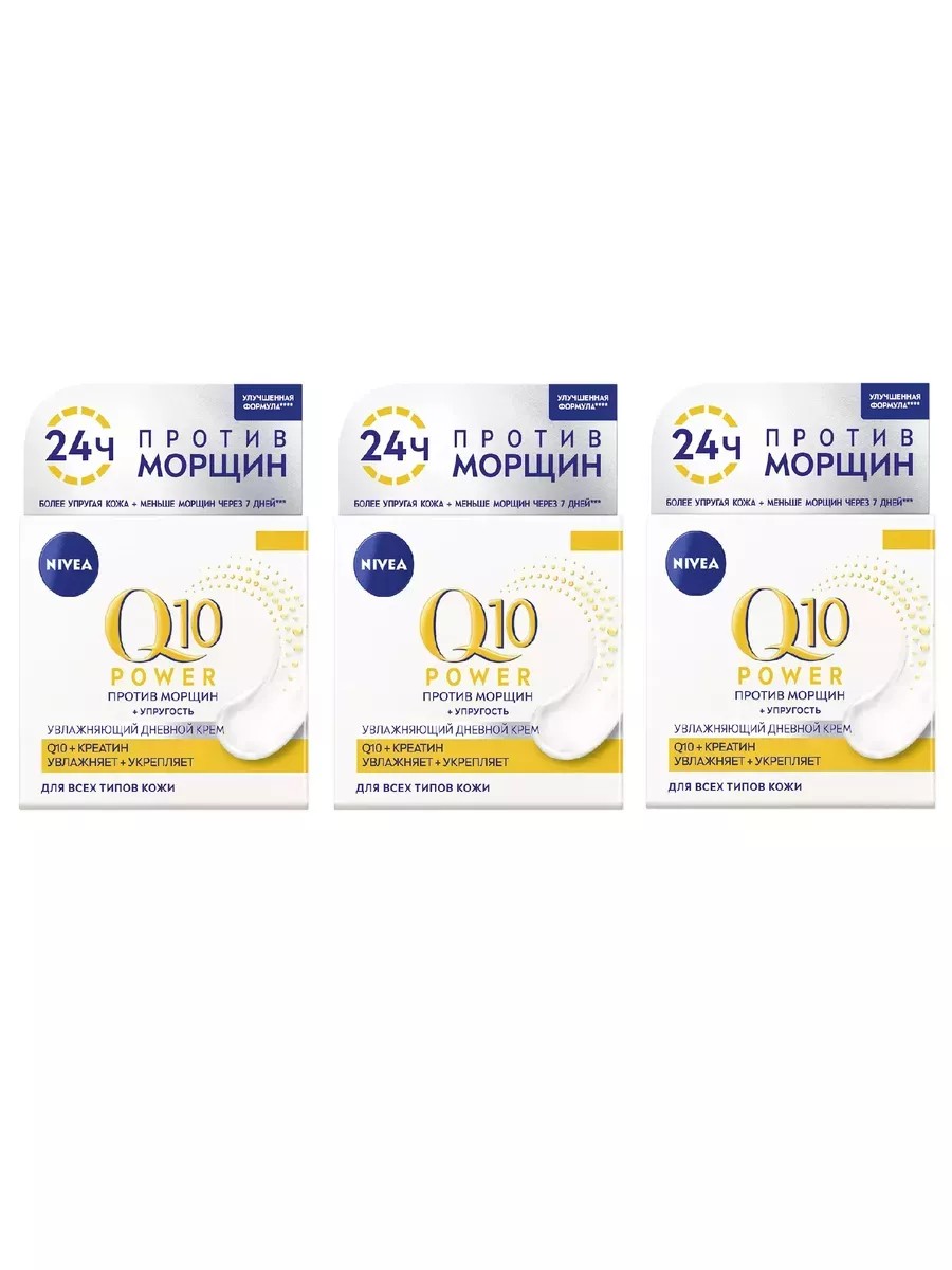 Nivea Q10 Power, Увлажняющий дневной крем против морщин 50 мл. Комплект 3 шт. Коэнзим Q10 и Креатин — естественные активные компоненты, которые содержатся в клетках кожи. Со временем их уровень снижается: кожа теряет способность к самозащите от неблагоприятного воздействия факторов внешней среды. В результате появляются новые морщины, а существующие - становятся глубже. Линия антивозрастных средств для кожи Nivea Q10 Power содержит родственные коже компоненты Коэнзим Q10 и Креатин, которые эффективно борются с морщинами и замедляют процесс старения кожи. Антивозрастной дневной увлажняющий крем для лица Nivea Q10 Power против морщин делает кожу более упругой (через 2 недели при ежедневном использовании) и заметно сокращает морщины (через 4 недели при ежедневном использовании). Подходит для всех типов кожи. Крем имеет солнце защитный SPF 15 фактор. Результат: морщины заметно сокращаются, ваша кожа выглядит моложе.